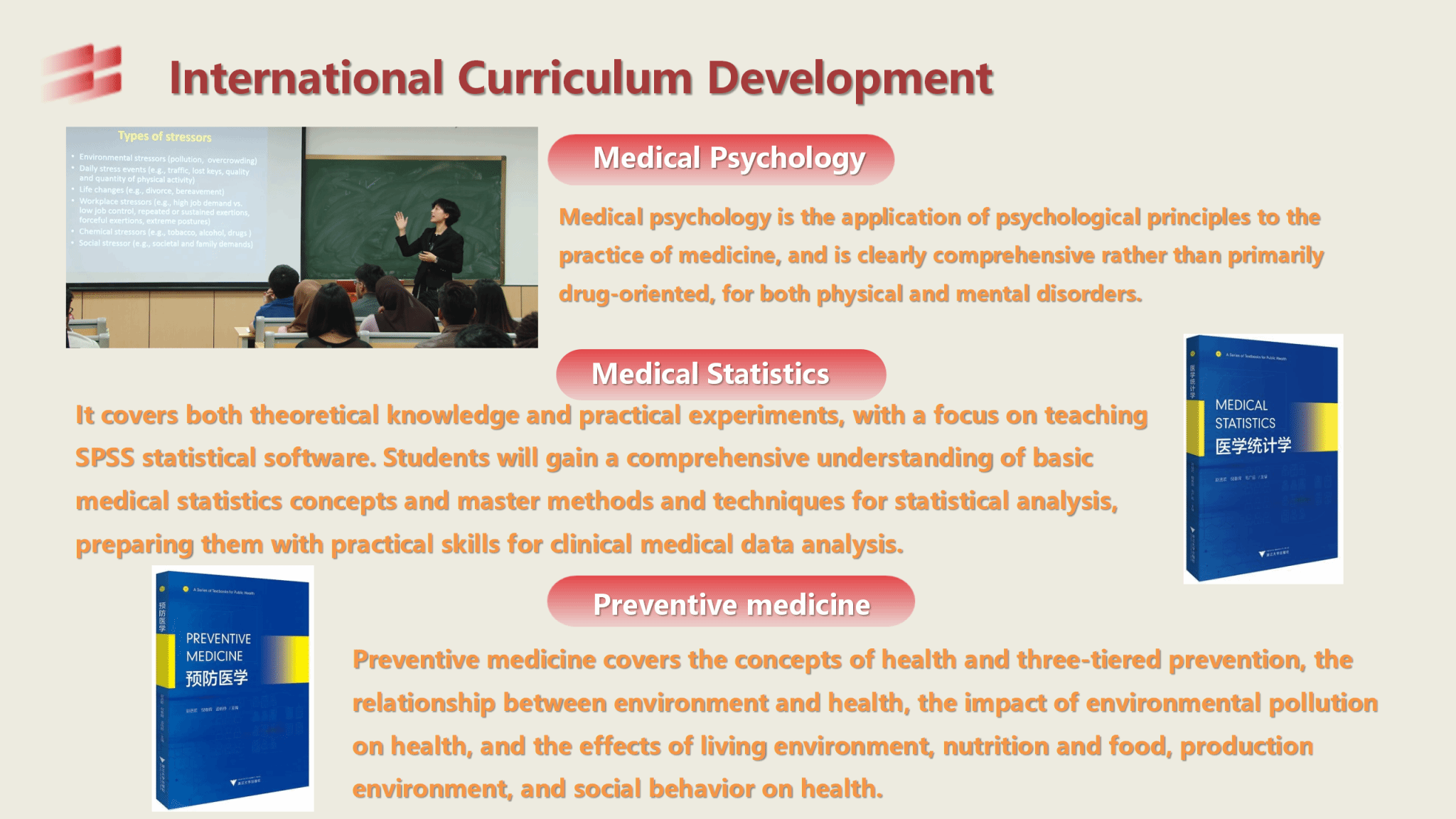 Main courses: human anatomy, physiology, biochemistry, medical genetics, medical immunology, pathology, medical ethics, diagnostics, internal medicine, infectious diseases, epidemiology, health statistics, environmental hygiene, labor health and occupational medicine, health chemistry, nutrition and food hygiene, children and teenagers’ health, maternal and child health, social medicine, health education, health service management, health microbiology, health toxicology, health economics and health law.