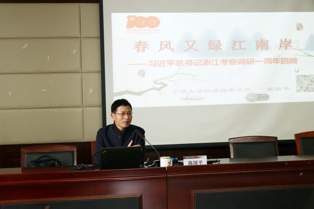 3月24日下午,医学院在王长来楼多功能厅举行《习近平在浙江》专题学习报告会,宁波市“习近平总书记在浙江、宁波考察时的重要讲话精神”专题巡回宣讲团成员陈国平副教授应邀作《春风又绿江南岸——习近平总书记浙江考察调研一周年回顾》专题报告,医学院全体教职工参加了报告会。