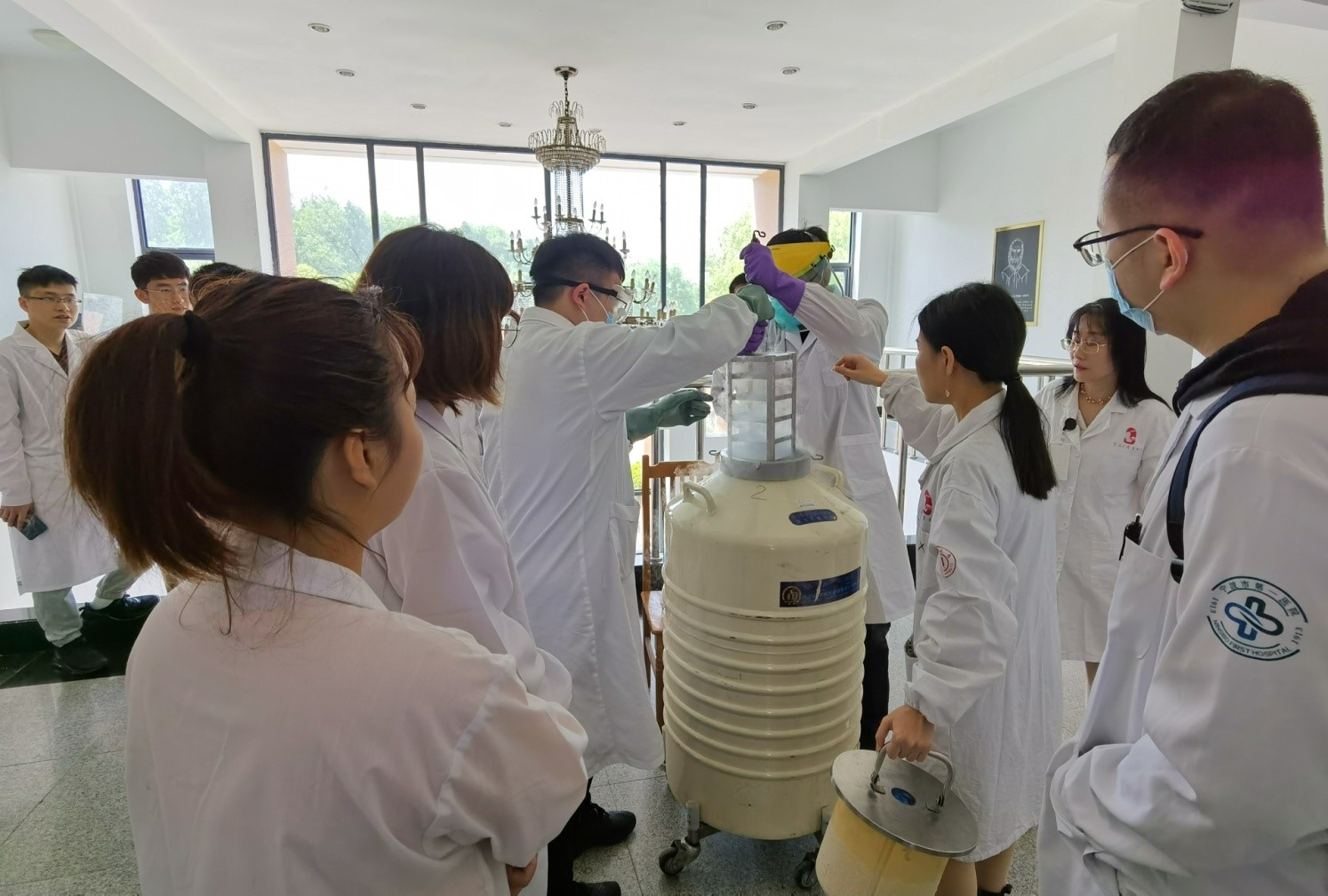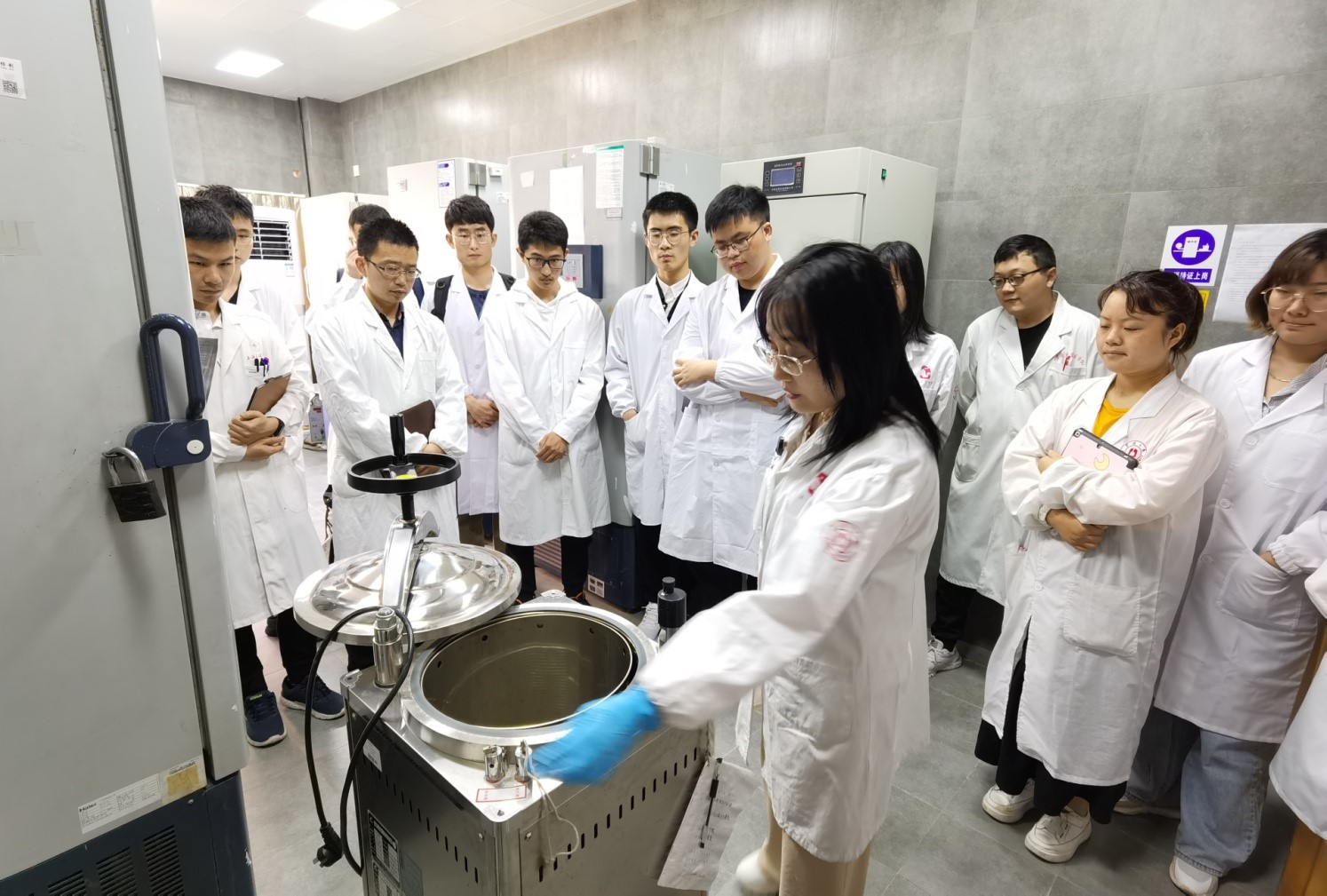 理论培训过后,学院组织了特种设备的现场操作演练。演练现场,医学院王潇博士讲解了液氮罐的使用过程中的危险性的防范,并指导学生现场演练操作了液氮罐的提取、拿放。同时,王潇老师和蒋雯雯老师分别演练了简单压力容器和全自动压力容器的操作程序并讲解了使用过程中的各类危险性的防范。