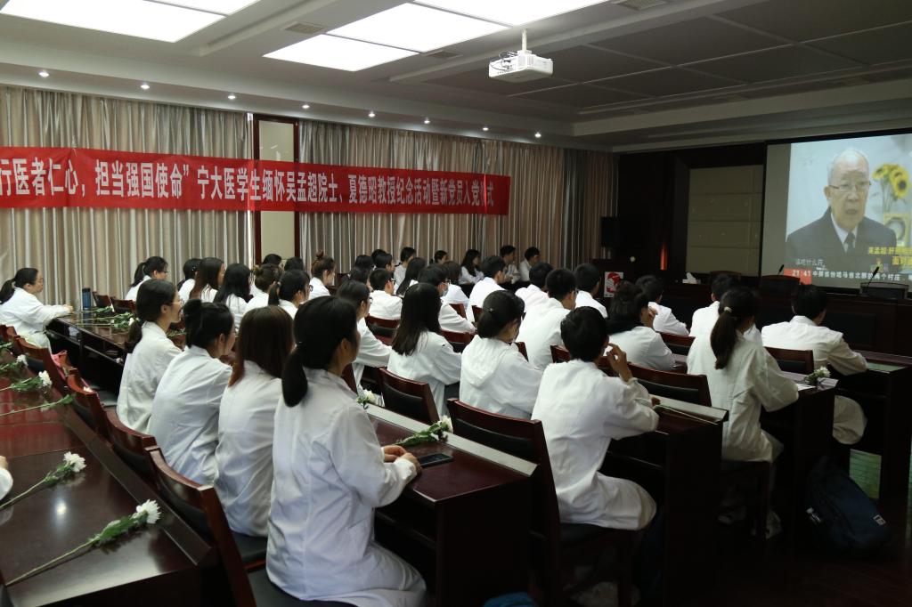 双星陨落、山河垂泪、日月同悲,活动现场同学们身穿白大褂,集体默哀悼念吴老和夏老,表达对两位医学泰斗的深切的敬仰和缅怀之情。默哀结束后,同学们观看吴孟超院士、夏德昭教授的先进事迹的相关视频,很多同学深受感动不禁潸然泪下。97岁仍主刀做手术的吴孟超院士曾说:“一个人生命有限,你不抓紧一下就过去了,所以我要抓紧时间,分秒必争,为国家,为人民多干点事”,告之医务工作者“不能为了钱去奋斗,而是实现你的理想去奋斗”。夏德昭教授毕生矢志不渝地追求眼科学事业,在角膜移植、中西医结合治疗病毒性角膜炎和视神经疾病领域造诣颇深,培养了国内外眼科界的多位骨干和学术带头人,兢兢业业为人民服务,百岁高龄仍工作在眼科临床第一线。作为优秀先进的共产党员他们跟党同龄、跟党同心、跟党同行,初心不改、砥砺奋斗,始终全心全意为人民健康服务。