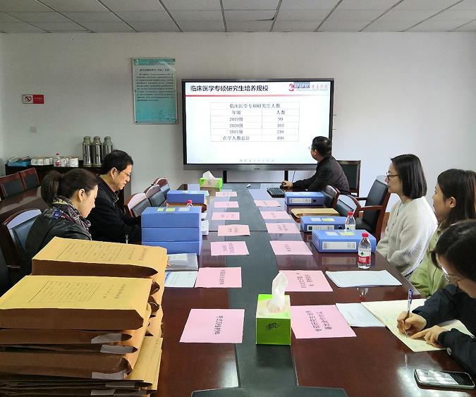 医学院分管研究生工作领导赵基源、医学院附属医院教学部主任戴盈分别做了医学院临床医学专业学位研究生培养总结汇报和附属医院专硕生住院医师规范化培训工作报告。检查组听取了汇报并对相关教学存档材料进行了仔细检查。