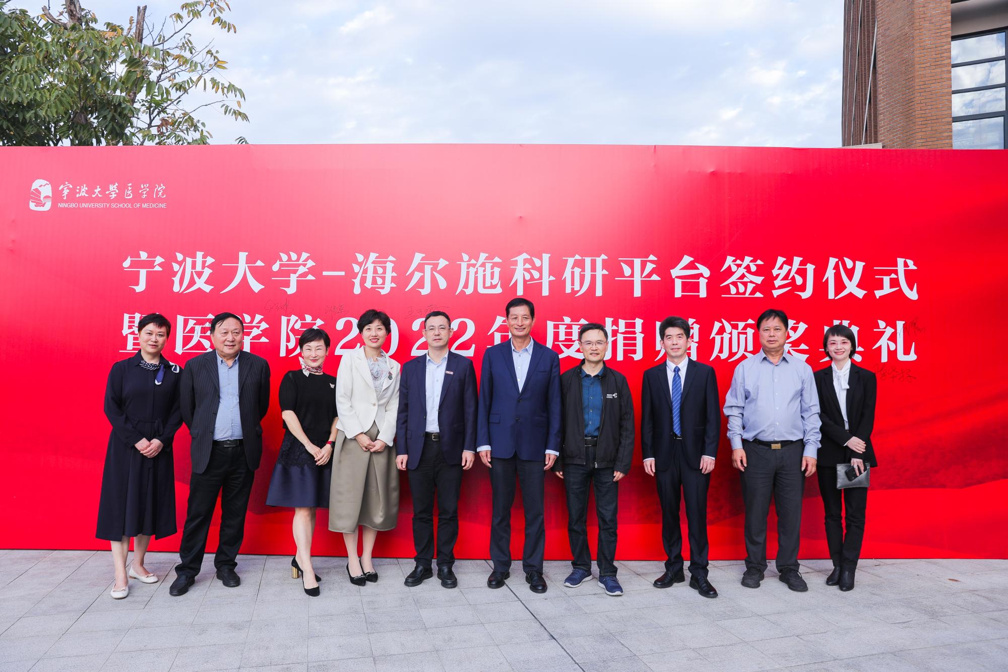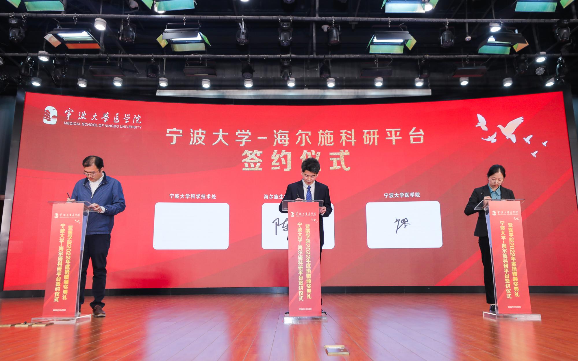 11月9日,Jinx漫画 -海尔施科研平台签约仪式暨医学院2022年度捐赠颁奖典礼在真诚图书馆报告厅顺利举行。海尔施生物医药股份有限公司董事长余剑伟、副总裁王子瑜,香港江兴国际投资有限公司董事长江兴浩、宏达货运储柜有限责任公司董事长陆汉幸、宁波中营能源集团有限公司董事长刘康荣、舍力(宁波)供应链管理有限公司董事长何翟等嘉宾参加典礼、校党委副书记童晓晖出席典礼并讲话。