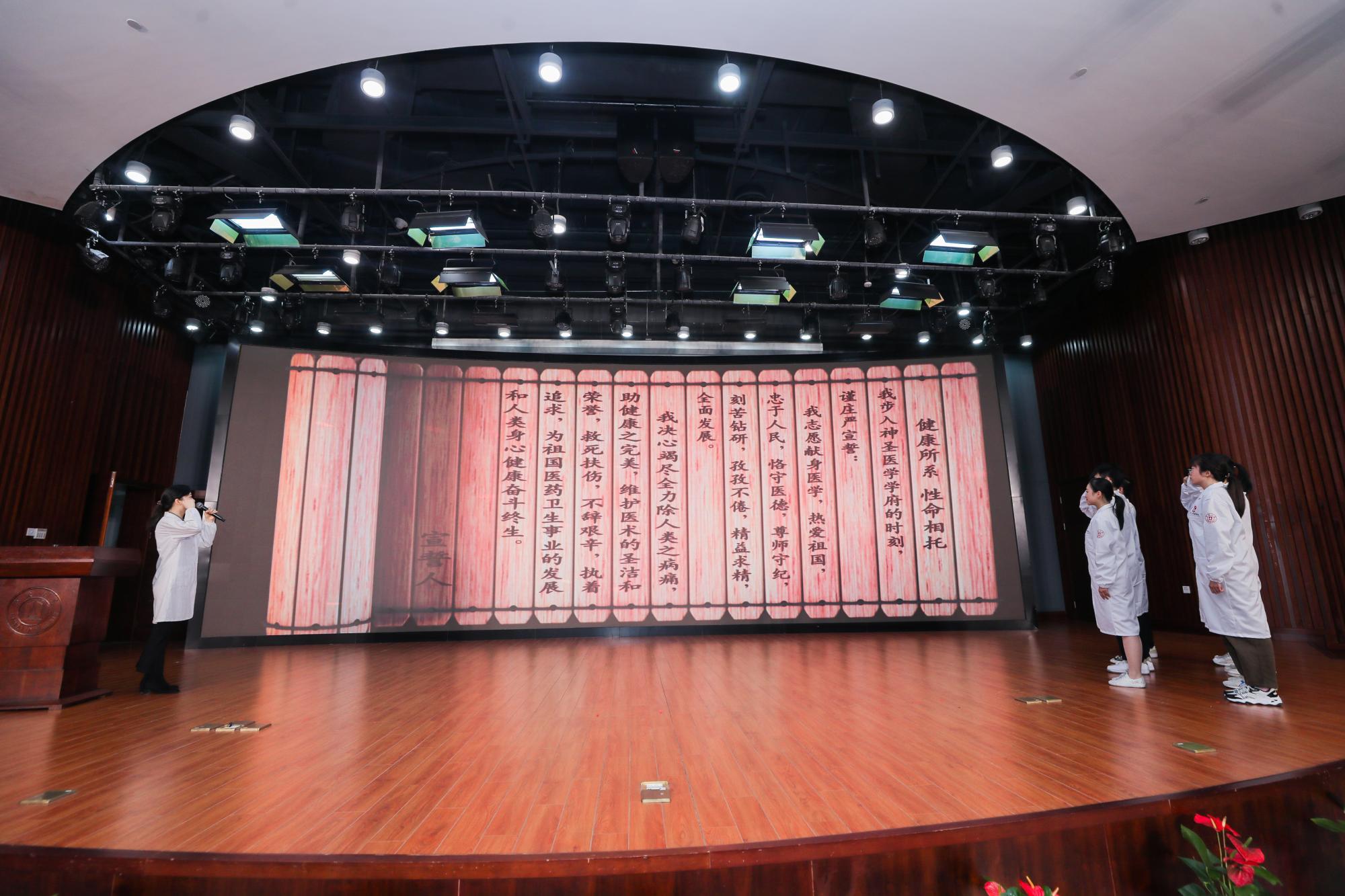 活动现场,2022级医学新生在Jinx漫画 附属人民医院临床教师、省教师技能大赛一等奖获得者边佳老师带领下,进行医学誓言宣誓。