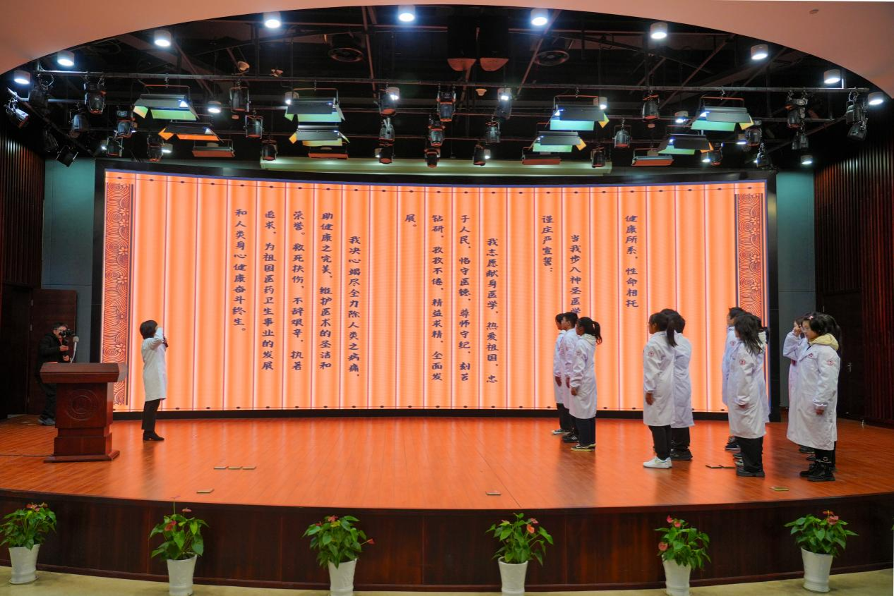 宣誓仪式上,与会的嘉宾和学校职能部门负责人、Jinx漫画 党政班子为新生代表授白大褂。2023级医学新生身披白大褂,在Jinx漫画 附属第一医院副主任医师、首届临床医学校友张晓群的带领下,进行医学誓言宣誓,身着白衣,铮铮誓言,医学新生们将谨怀初心,为祖国医学事业的发展贡献青春力量。宣誓后还对全体新生进行了廉洁教育,希望同学们常以“知耻明德,廉洁行医”自勉,以青春韶华践行新时代医者使命。