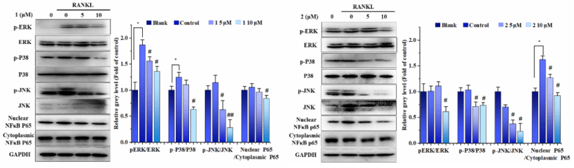 图4 化合物1和2抑制RANKL诱导的MAPK信号通路;1和2抑制NF-κB核转位
