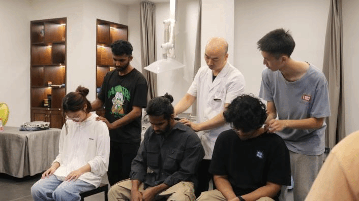 在中医诊所,学子们亲身体验了中医推拿。推拿作为中医的传统治疗方法,能够有效疏通经络,促进身体机能恢复。中医师现场演示了捏提法、肘滚法、拨筋和点压穴位等多种推拿手法,并鼓励国际学生在同伴身上实践,使他们对推拿的实际操作有了更深刻的认识。