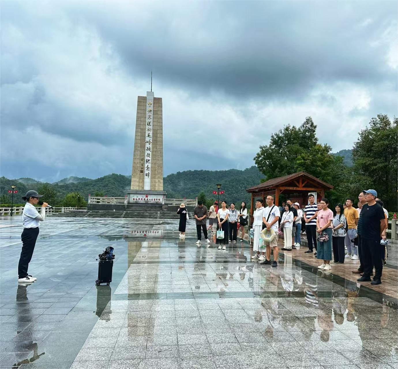 第三站是中复村——红军长征第一村,党员们在这里进行了第二场党课。在老师的带领下,党员们走过了“红军桥”,看到了桥上“救国不分男女老少”的宣传语、触摸了当初刻下的“人比枪高当红军”的生命等高线,走进了观寿公祠,看见了当年枪弹与炮火留下的累累伤痕。在祠堂内,授课老师生动还原了1934年期间,发生在红军桥上人满为患报名参军的场景,在公祠内红九军团指挥松毛岭战斗的场景,在松毛岭上红九军团、红二十四师和闽西地方武装七天七夜奋战的场景,在“长征零公里处”碑文旁将士们踏上万里长征前与家人道别的场景。为了致敬这段历史,缅怀先烈,党员们一行登上了松毛岭,深刻悼念为革命英勇牺牲的无名英雄们。