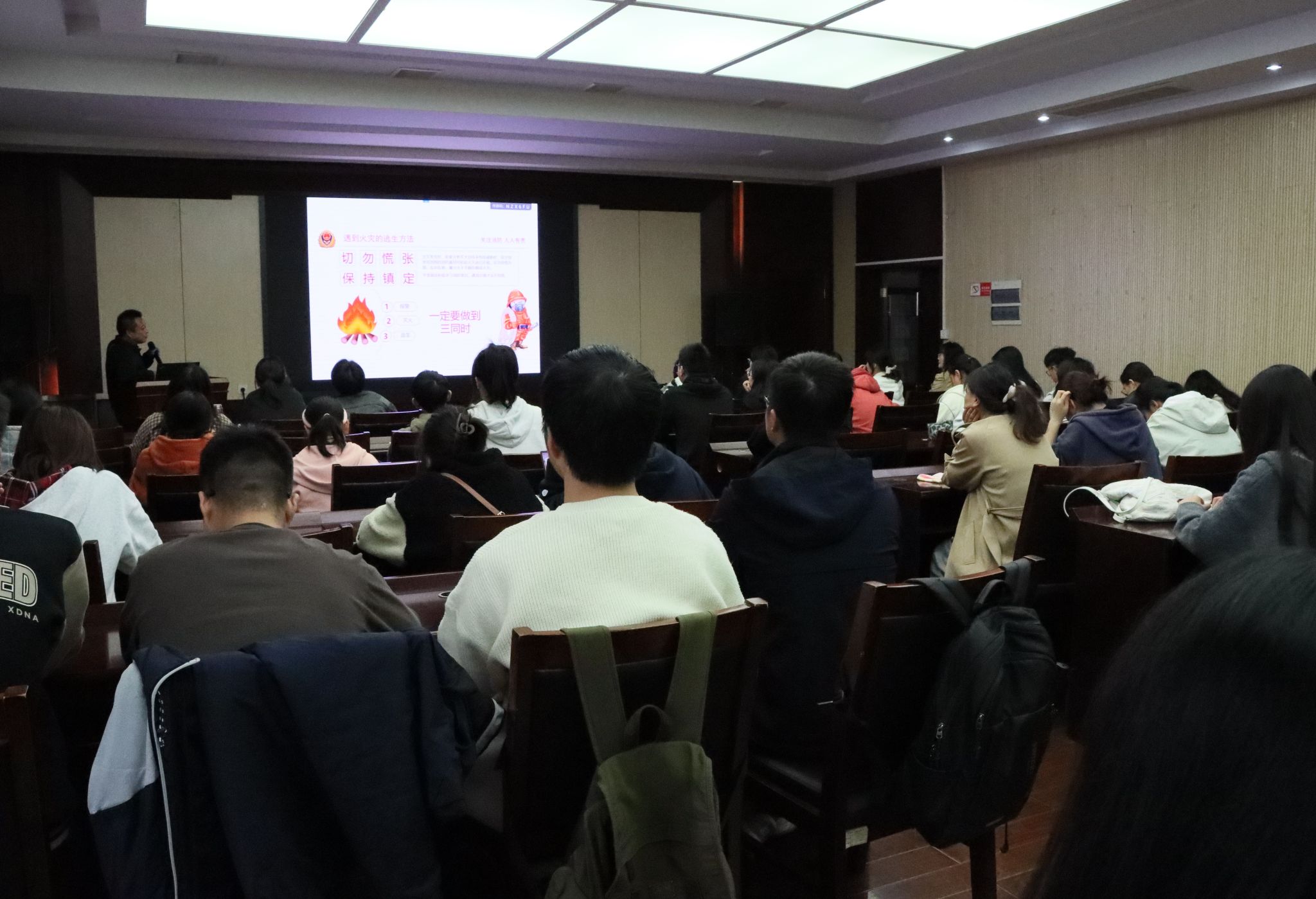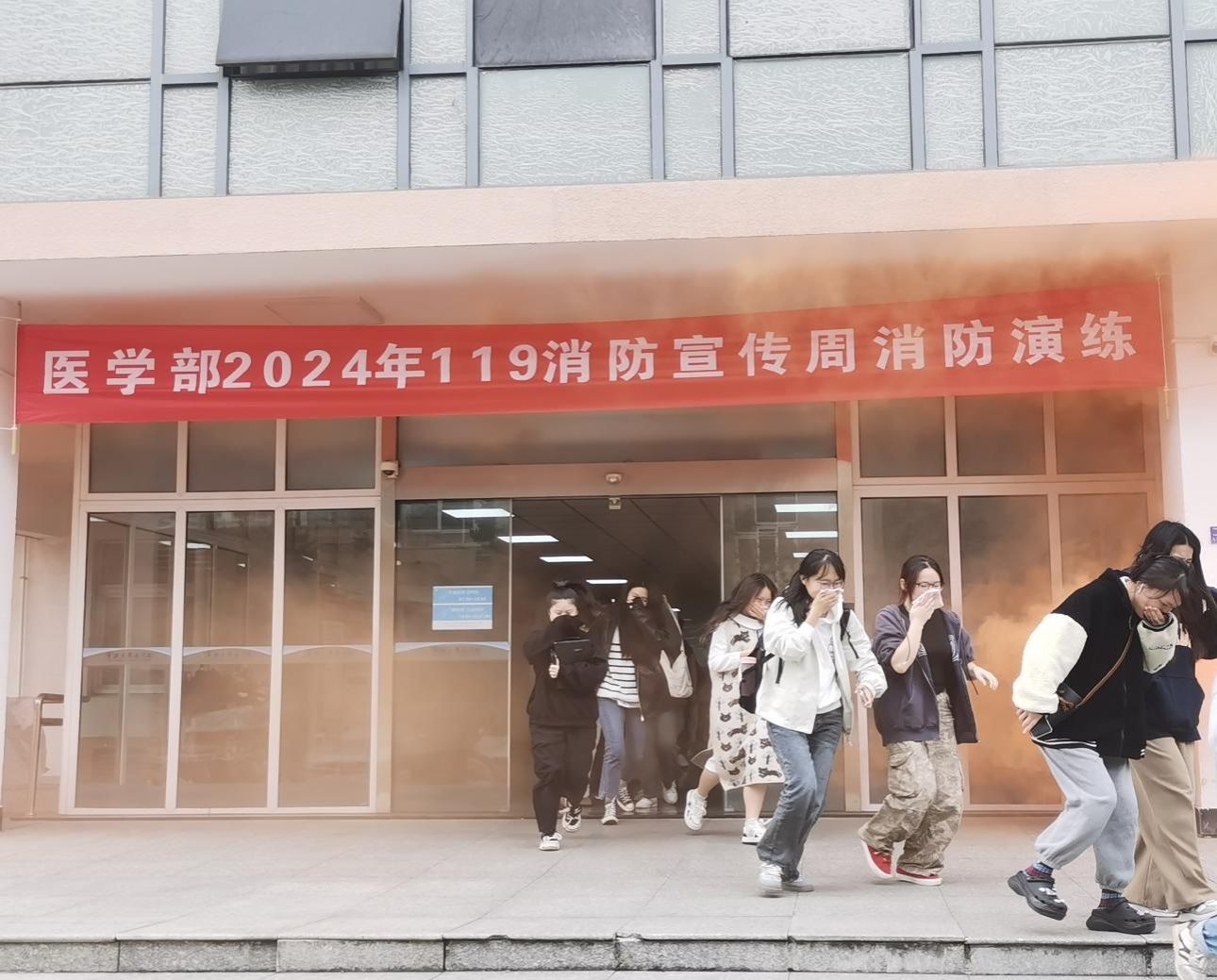 在演练开始前,保卫处工作人员进行了消防安全主题讲座,讲解了灾难发生时灭火器的使用、逃生方法以及注意事项。演练在一阵急促而又刺耳的警笛声响起开始,学部安全员立即对学生进行安全疏散和引导,学生们弯着腰、用手帕、湿毛巾或衣袖捂住口鼻、沿着墙壁、楼梯快速有序的按照指定路线“逃生”,全体师生安全到达至真楼前空旷地。