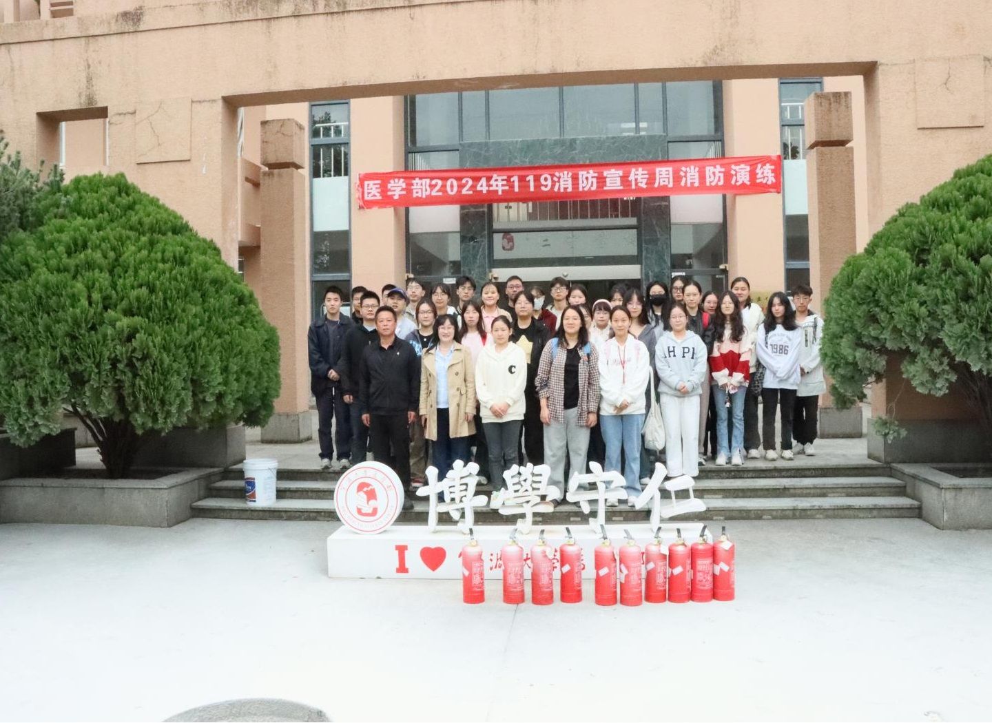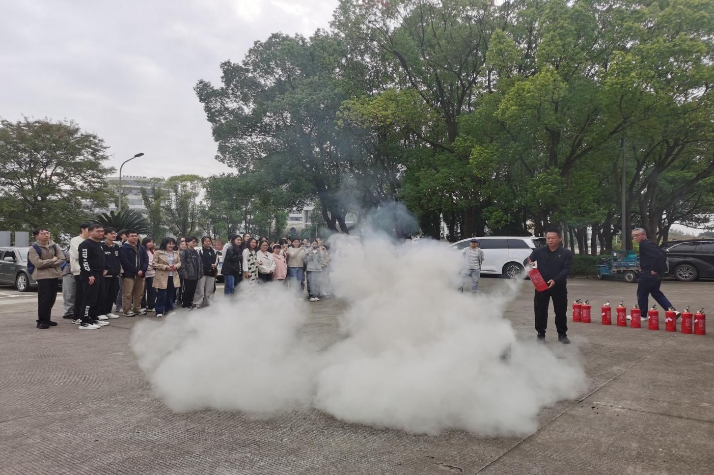 演练结束后,保卫处工作人员为师生演示了灭火器的灭火操作方法。在实践模拟环节,师生们在他的指导下,拔掉灭火器栓塞,提起灭火器,对准火源,按下手柄,成果扑灭了火焰。