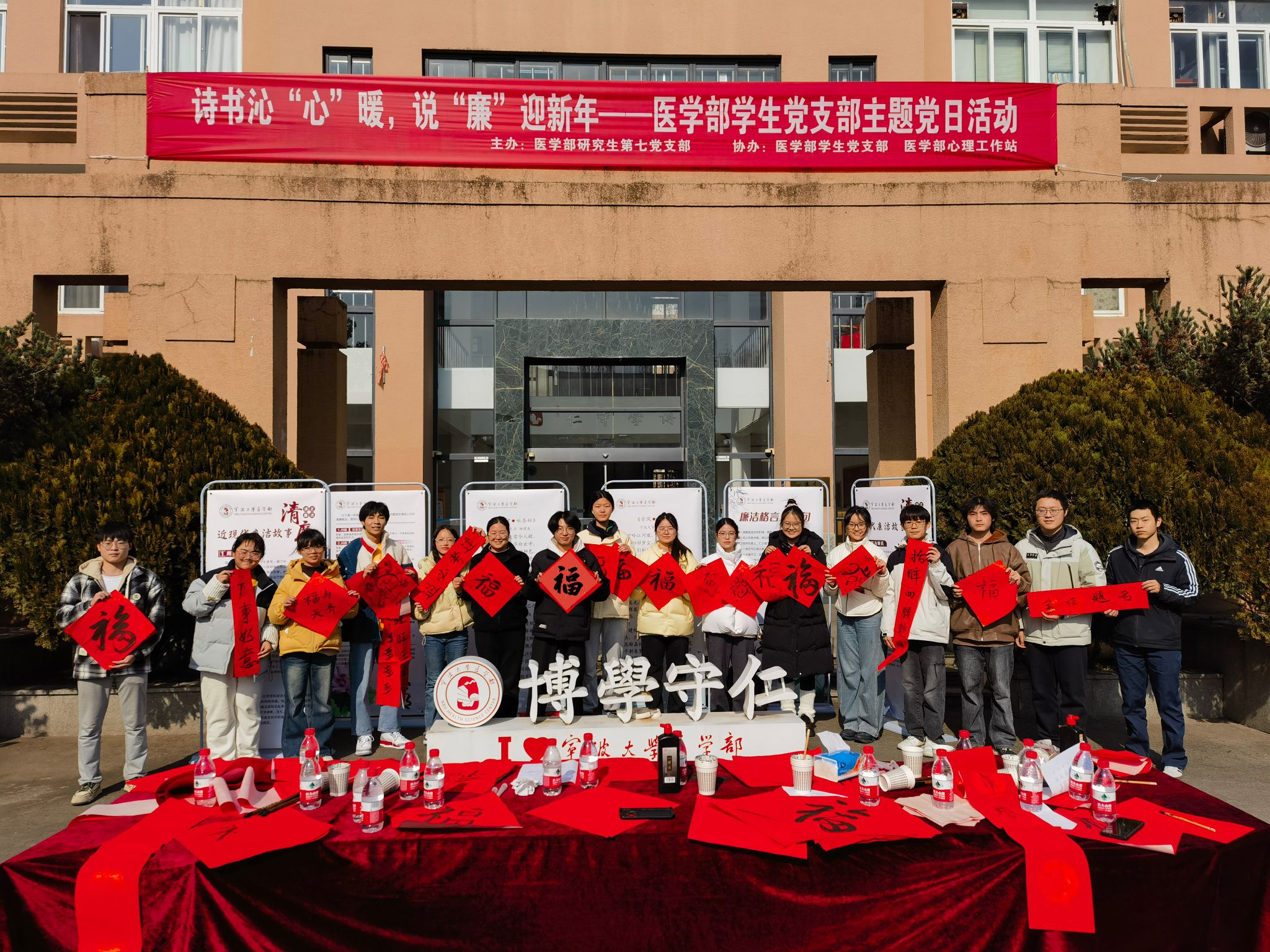 活动前期,学部特邀退休教师柳建发副教授创作了关于廉洁主题的诗词,并搜集了近现代廉洁故事、格言警句等进行了现场展示,使师生们对于廉洁有了更深入的理解,更有师生对出“廉似梅花不畏寒,清如秋菊何妨瘦”、“一身正气上班去,两袖清风回家来”等诗句,号召广大党员、师生廉洁过新年。在书写对联时,师生们以书法的艺术之美,展现了深厚的文化底蕴,“廉”“发”“福”“科研顺利”等祝愿跃然纸上,体现了师生们对于来年的美好期待。