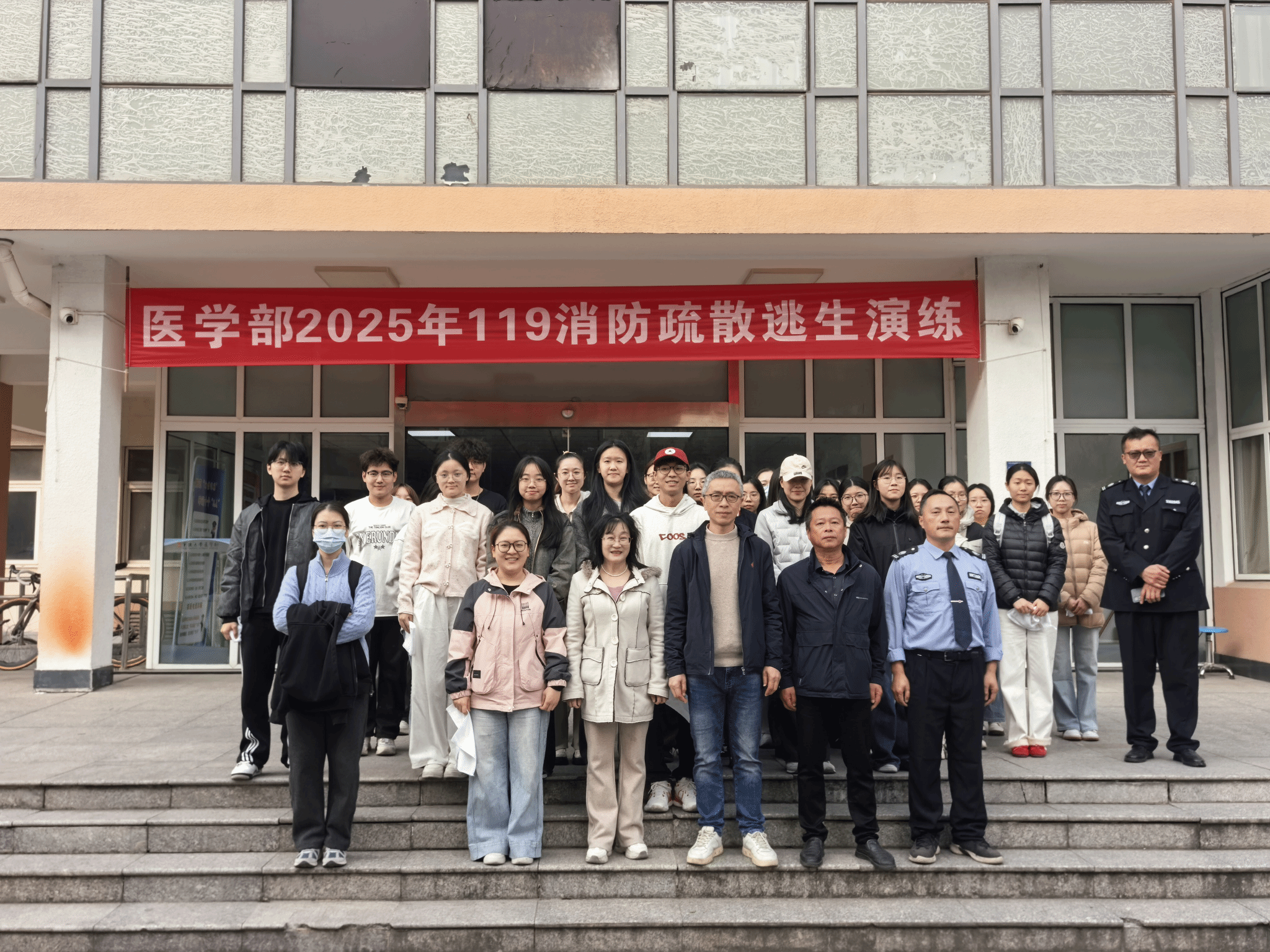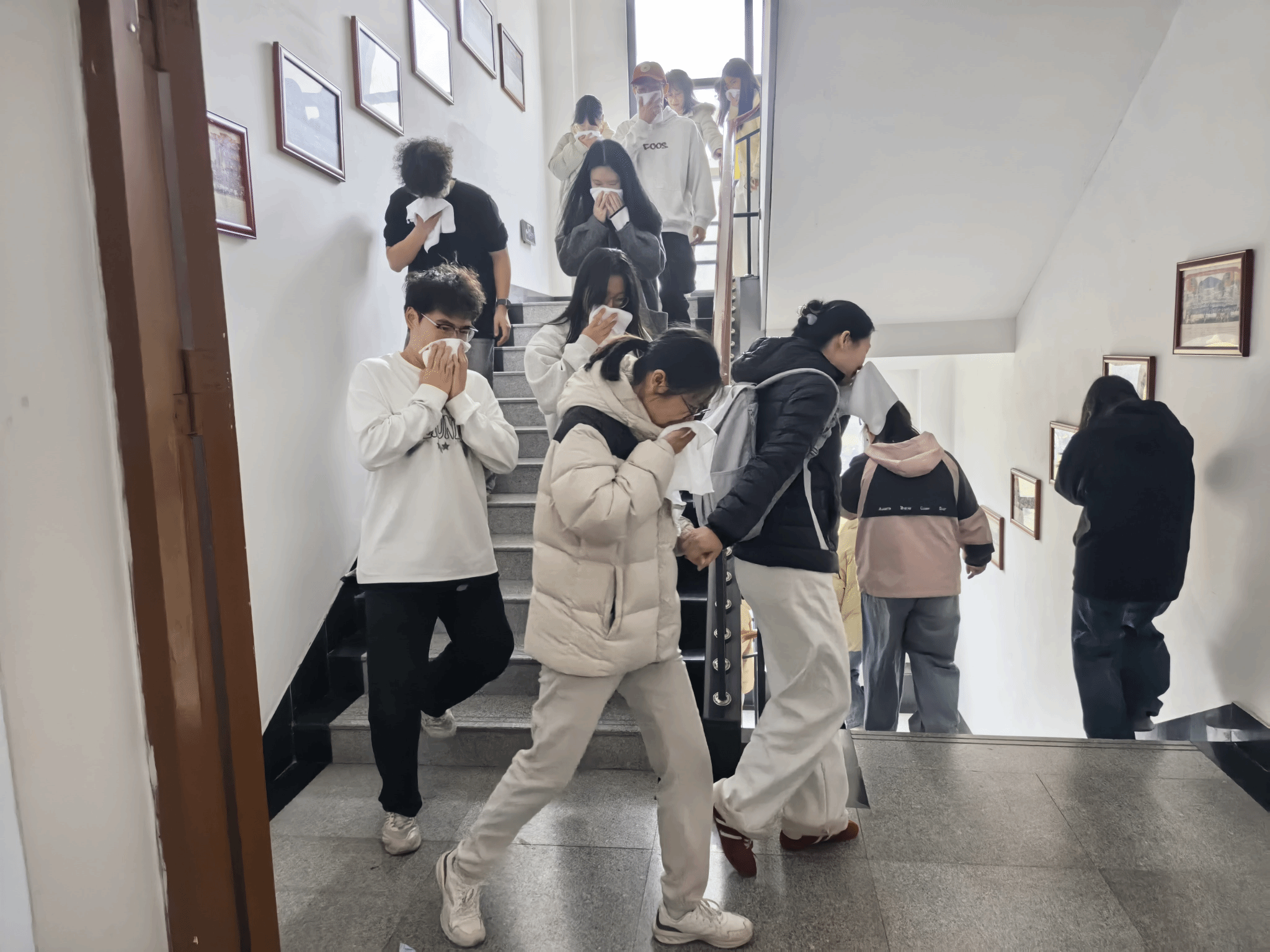 随着警铃声响,参与演练的师生们迅速从防火通道口撤离。安全员按照预案指引疏散,确保楼内人员安全撤离,防止出现拥挤或踩踏情况。师生们神情专注,用湿毛巾捂住口鼻,从王长来楼5楼快速、有序地疏散至楼外大门东侧开阔安全区域,整个逃生过程紧张而井然有序。