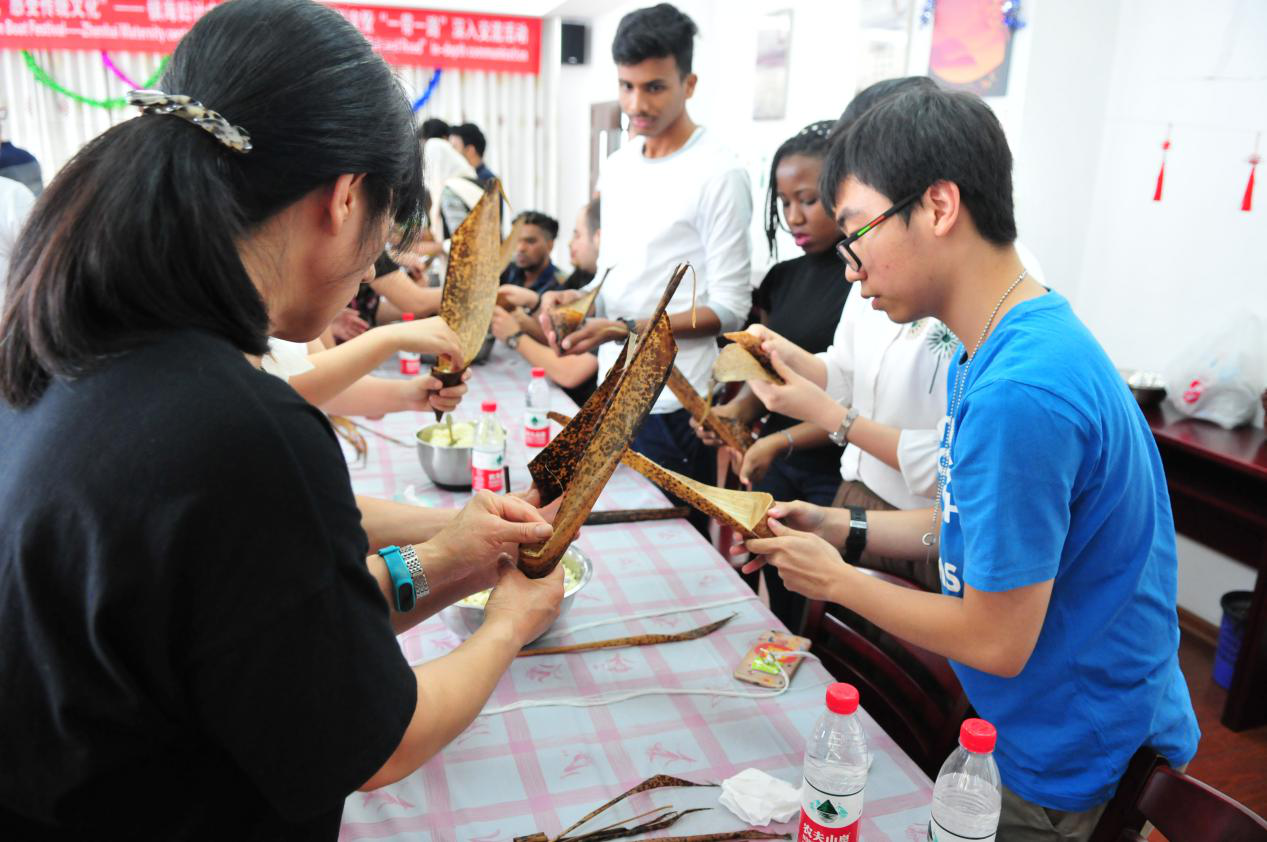 随后留学生们开始包起了粽子,第一次见到粽子的留学生们又好奇又兴奋,看着浸泡过的糯米和散发着香味的粽叶,留学生们七嘴八舌,纷纷询问包粽子的步骤。在几位“高手”的演示和指导后,大家开始有条不紊地剪粽叶,叠粽叶,放糯米,系绳子,妇计中心的工作人员也参与其中,与留学生们一起动手包粽子,大家一遍一遍地尝试和摸索,有不少留学生还将粽子形状进行了创新,多种形状的粽子争相斗艳,大家互相协作,交流着包粽子的心得与体会。“这是我第一次在端午节做香囊,包粽子,我非常喜欢”一位来自坦桑尼亚的留学生开心地说道。