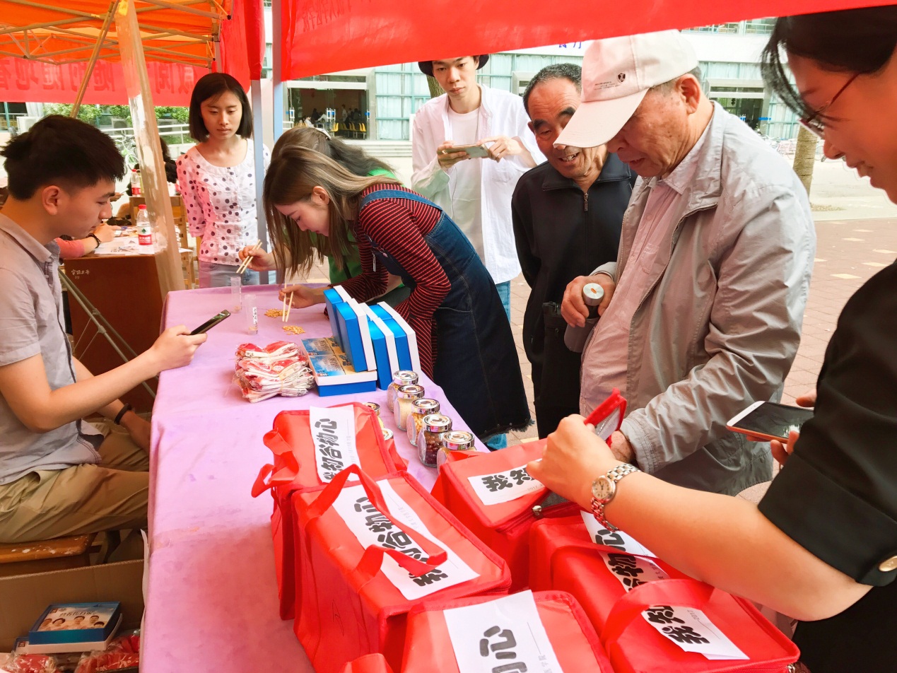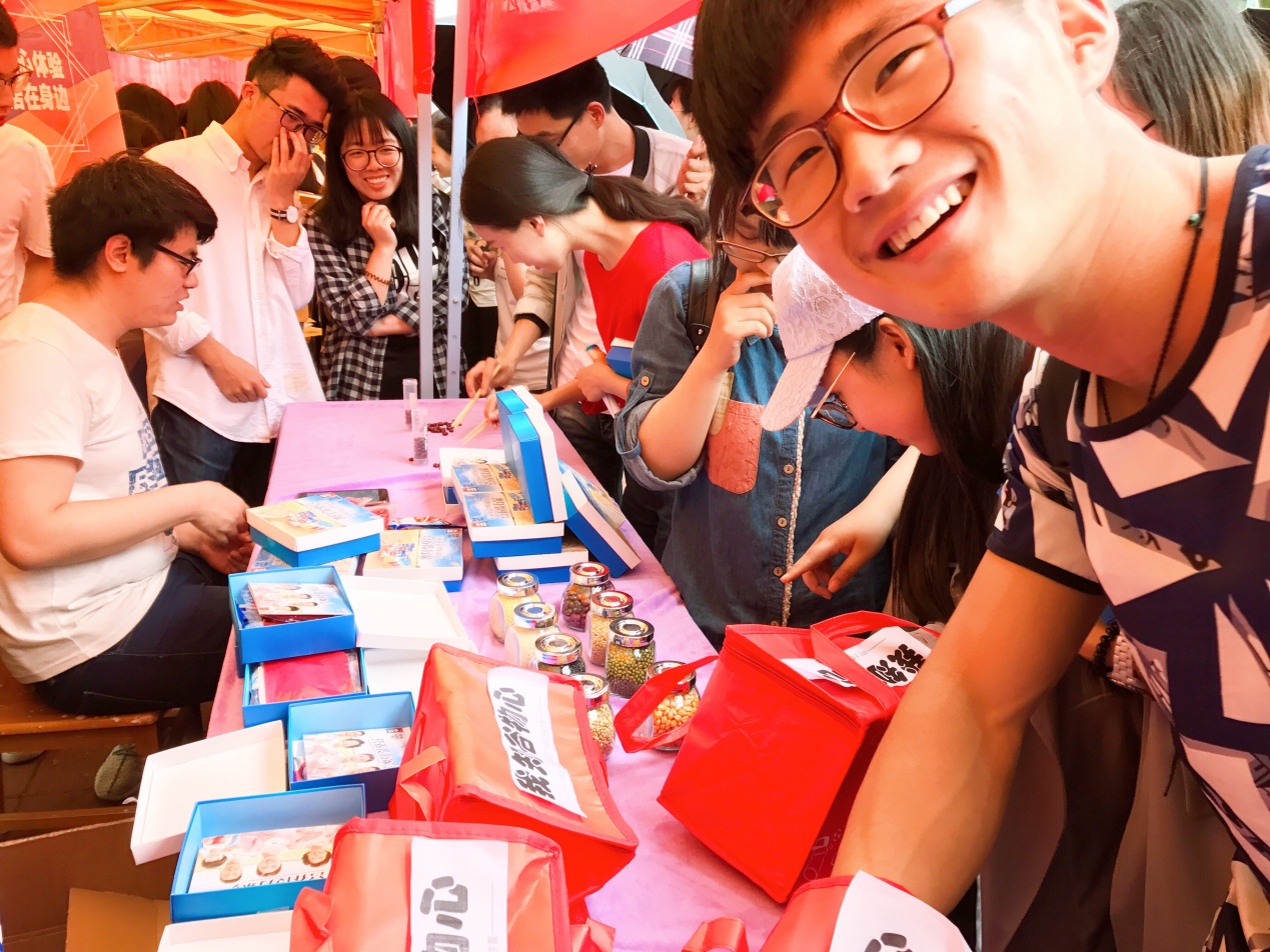 在户外广场宣传中,活动通过互动游戏形式——“谷物夹多少”和“我知谷物心” 将“全谷物,营养+,开启营养健康谷物新时代”的主题轻松地传达给每一位驻足参与的老师和同学。其中“谷物夹多少”以两人比拼的形式,遴选出在一分钟内夹指定谷物多者为获胜一方。在这个过程中,考验了大家分辨日常谷物的能力,带大家了解一些平常只听过名字却没有见过的谷物。“我知谷物心”采用盲摸的形式,让大家通过触感来判断出暗箱中所盛放的两种谷物,感受最天然的谷物形态,进一步加深对日常谷物的了解。活动现场气氛活跃,大家参与度高。