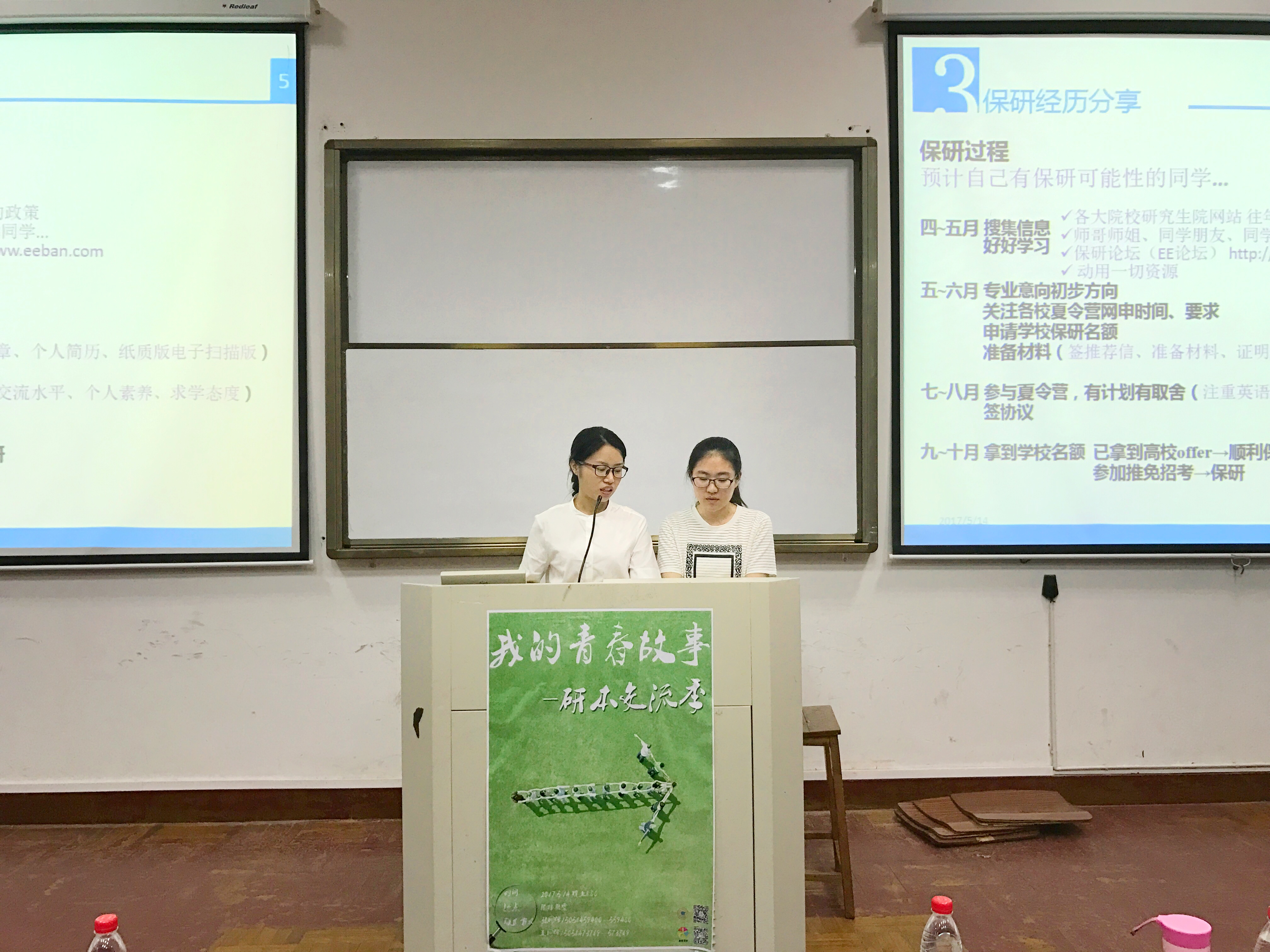 本届研本交流会邀请了五位已获得攻读硕士研究生资格的大五学生作为主讲人,包括以414高分考取苏州大学的温阳辉、考取上海交通大学的汪燕、成功保送浙大和华中科技大学的李昕琳和江毓佳、选择在本校继续深造的方立彪等。这些优秀学子们与在场的学弟学妹分享自身的考研经历,指导大家如何在考研和工作上做出权衡取舍,并介绍在考研过程中怎样把握各科的复习方法、如何挑选考研学校以及专业。李昕琳和江毓佳给大家分析了在研究生复试中的面试环节,并对同学们普遍关心的选课制、导师制和研究生生活情况做了详细介绍。