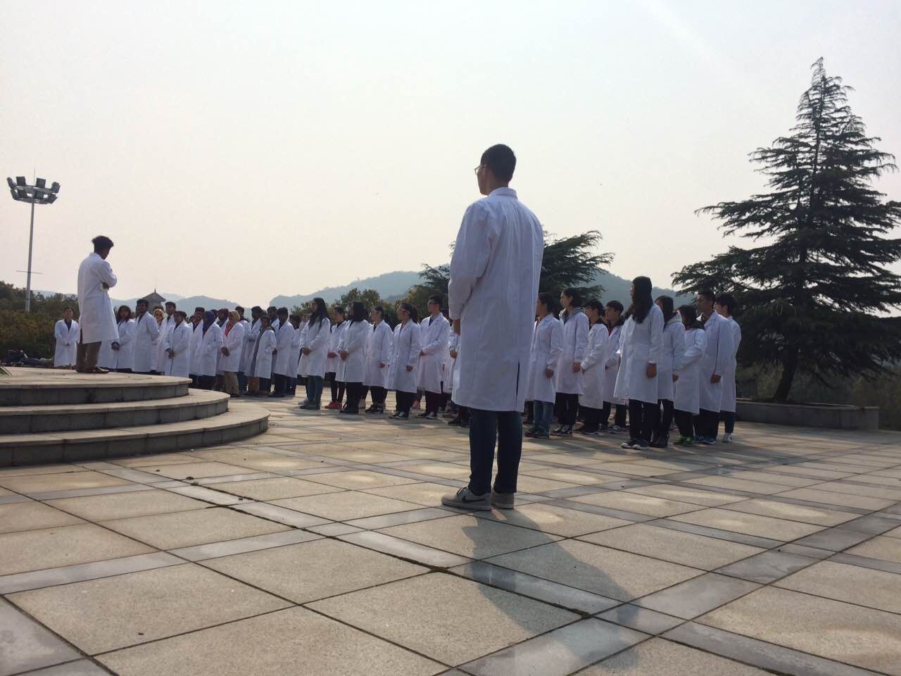 庄重的哀乐响起,医学生们肃穆站立,低头闭眼默哀,所有人的内心在此刻都是安静的。礼毕,大家手举鲜花依次向伟大的无言良师献上自己的真心。紧接着是中外学生代表的发言并带领大家一起宣誓,最后,中外医学生们自由参观捐献者墙。观瞻奉献者,永存医者仁心。