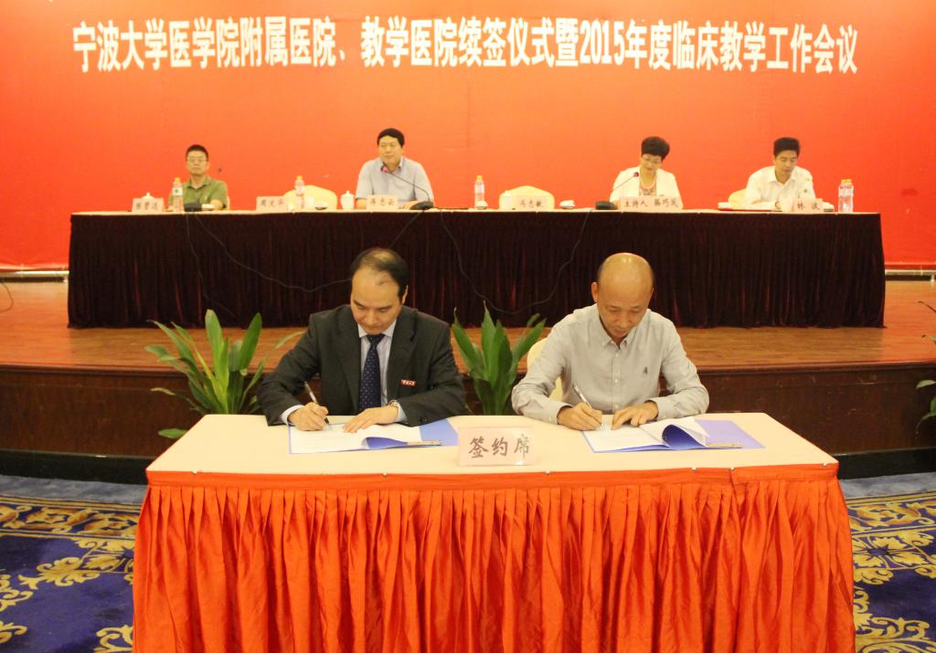 10月22日,宁大医学院举行附属医院、教学医院续签仪式暨2015年临床教学工作会议。副校长冯志敏、市卫计委副主任蒋志云出席会议并讲话。会议由医学院党委书记骆巧凤主持。市卫计委医政处、校教务处相关负责人,医学院领导班子,8家附属医院、10家教学医院主要负责人和分管负责人,各医院科教科科长和老师,优秀临床班主任、本科生导师和带教老师及医学院教师代表等参加了会议。
