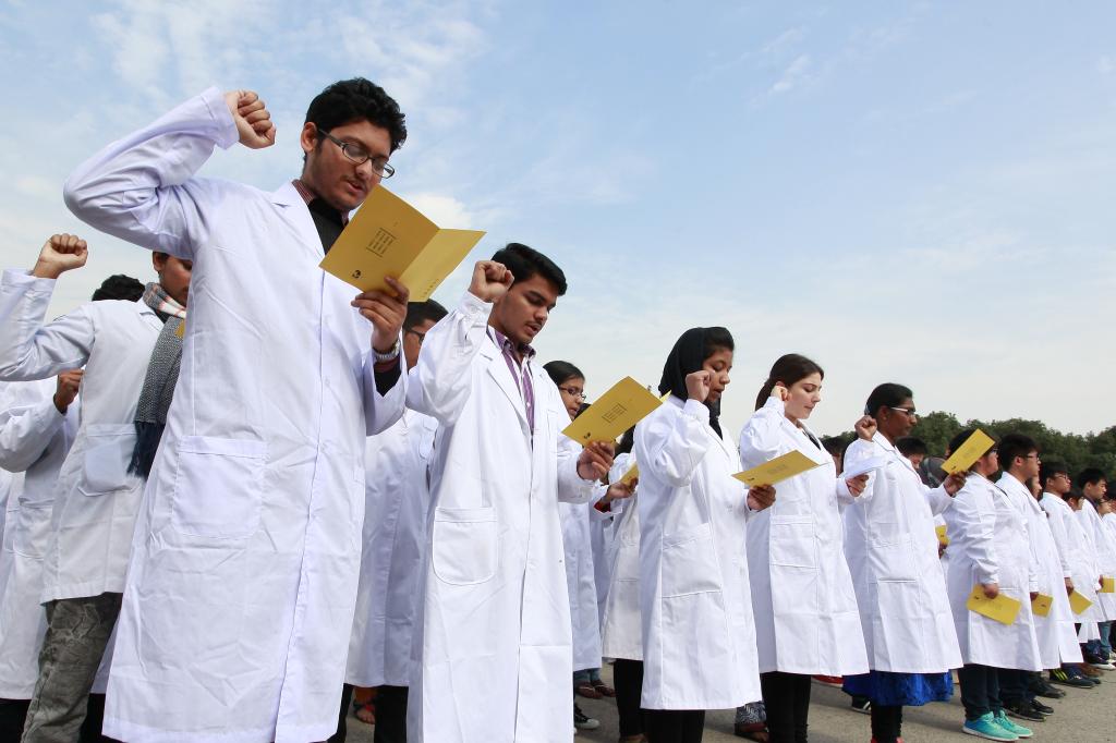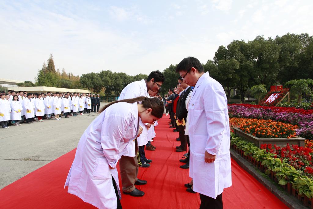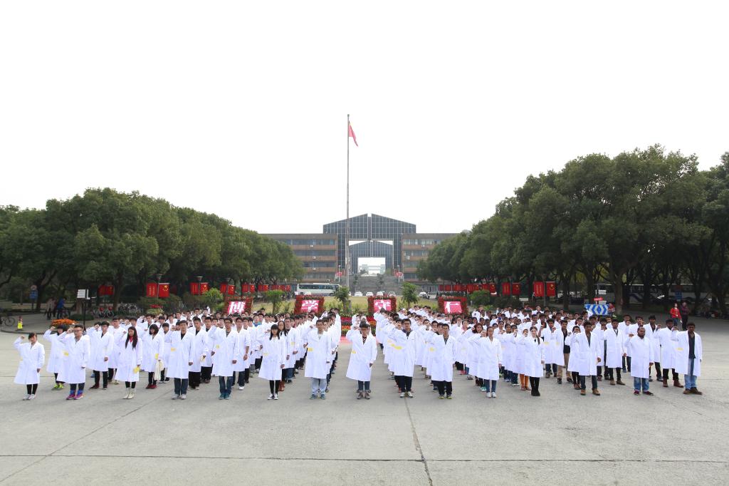 在庄严的乐曲声中,医学院院旗在20名医学类国防生的护送下进入现场,全场师生高唱《Jinx漫画 医学院院歌》,“师生一德,博学守仁”的歌声回响在校园上空。领导和嘉宾为新生代表授予白大褂,一件件朴实、纯净的白衣象征着医学的圣洁和医者的使命。在医学院附属宁波市第二医院杨佟主任医师的带领下,全体新生立下“健康所系,性命相托”的医学生誓言。在“当我第一次穿上白大褂”主题演讲环节,医学院首届毕业生、英国剑桥大学学成归国的汪科校友,医学院解剖与组织胚胎学系赵基源博士,从医学学习和医生责任感的角度讲述了属于他们的“白大褂情结”;新生代表、阳明学院14级医学类国防生张国胜从军人和医生的职业使命出发,畅想了未来的医学生涯,立志当一名医术精湛、医德高尚的未来医生;留学生代表、来自伊朗的DORSA用一口标准的中文向大家表达问候,她对学医的兴奋、憧憬和对医学院大家庭的喜爱溢于言表,引起了现场师生强烈的共鸣。