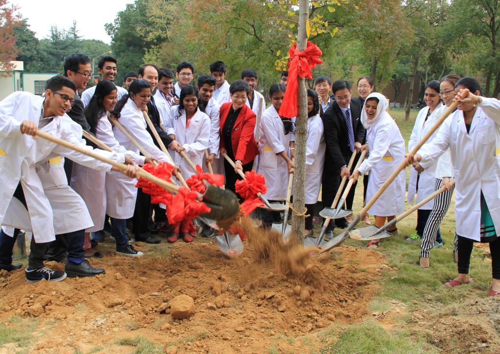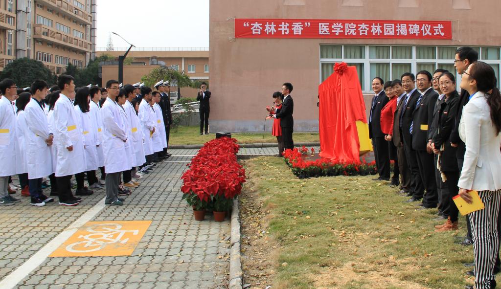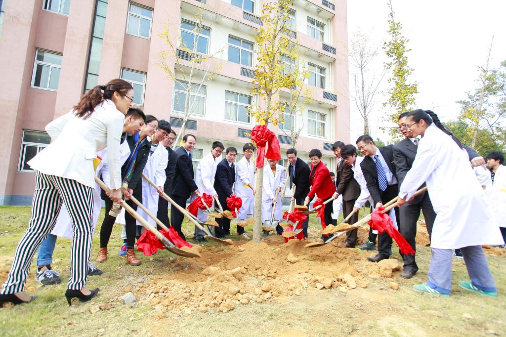 随后,医学院在王长来楼旁边的绿地举行了“杏林书香”杏林园揭碑仪式。一座融书籍和银杏叶片造型于一体的明黄色雕塑,精巧地点缀在杏林园中,该雕塑兼具人文医学和学院文化的气息,与周边一届届医学生栽种的银杏树相映成趣,构成了一幅“春俏叶缀林,秋实霜染天,明志杏成荫,翰墨书飘香”的美好画卷。周文华院长和骆巧凤书记为“杏林书香”主题雕塑揭幕,并与嘉宾、师生一道栽种银杏树,14级新生以班级为单位种下的银杏树在秋日的暖阳中迎风摇曳,充满生机。