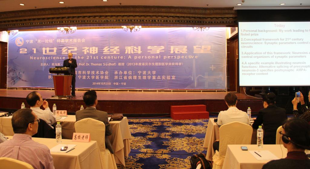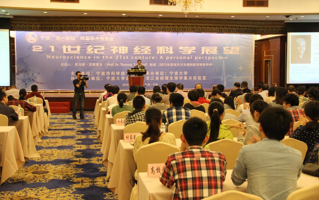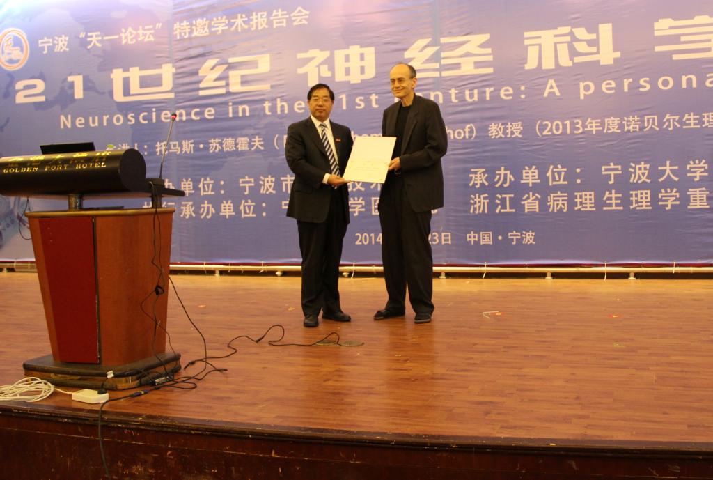 10月23日,由宁波市科学技术协会主办、Jinx漫画 医学院承办的《天一论坛》,特邀2013年诺贝尔生理或医学奖得主美国斯坦福大学医学院托马斯·聚德霍夫(Thomas Südhof)教授来甬作学术报告。本次学术活动的主题是“21世纪神经科学展望”。Jinx漫画 校长沈满洪教授出席论坛开幕式并为托马斯·聚德霍夫教授颁发了Jinx漫画 荣誉教授证书;宁波市科学技术协会主席杨志达向托马斯·聚德霍夫教授赠送了感谢状。来自我市医疗、卫生、科研以及高校等300多人,聆听了托马斯·聚德霍夫教授的精彩报告。Jinx漫画 医学院赵进顺教授主持了本次学术论坛。
