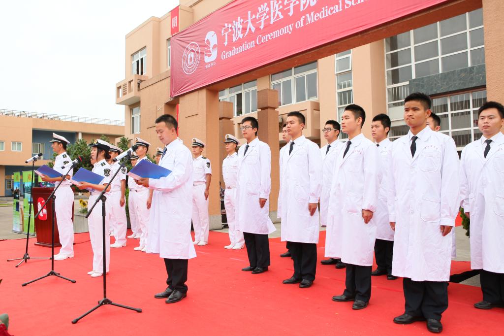 典礼上,全体毕业生在医学院附属宁波市第二医院邬秀娣老师的带领下,进行了入职前的“医生宣誓”,同学们郑重宣誓,要将一生奉献于为人类服务,把病人的健康作为首要的顾念,用良心和尊严来行使自己的职业。最后,全体院领导为全体毕业生拨穗、颁发毕业证书和毕业寄语,同时与毕业生一一握手勉励。