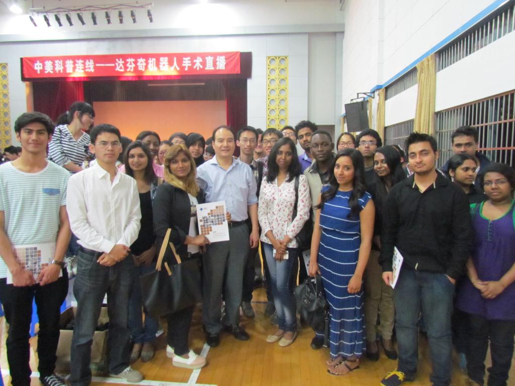 5月21日晚,由浙江省科学技术协会、美国纽瓦克贝斯以色列医疗中心、美国新泽西自由科学中心共同主办的第二届中美科普连线——“达芬奇机器人子宫肌瘤摘除手术”直播活动在宁波市惠贞书院举行,医学院作为执行承办单位组织了50名中外学生前往观摩。