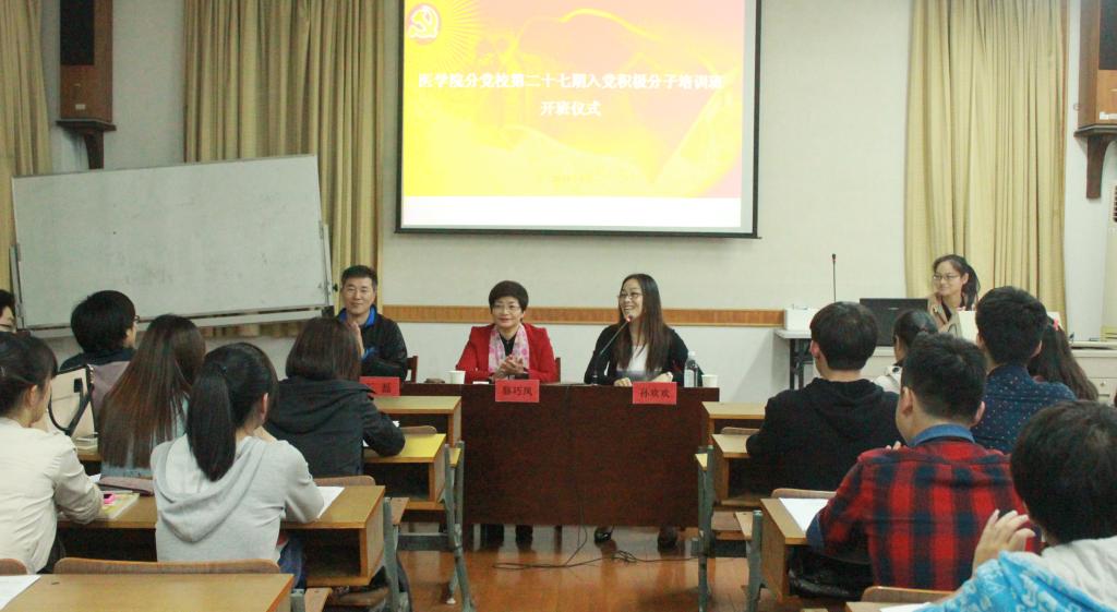 5月4日,正值“五四”运动九十五周年纪念日,在这个特殊的日子里,医学院分党校第二十七期入党积极分子培训班开班仪式在至真楼404室举行。医学院党委书记骆巧凤、党委副书记孙欢欢、学工办相关老师和全体党校学员参加仪式,会议由孙欢欢老师主持。