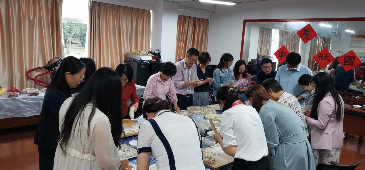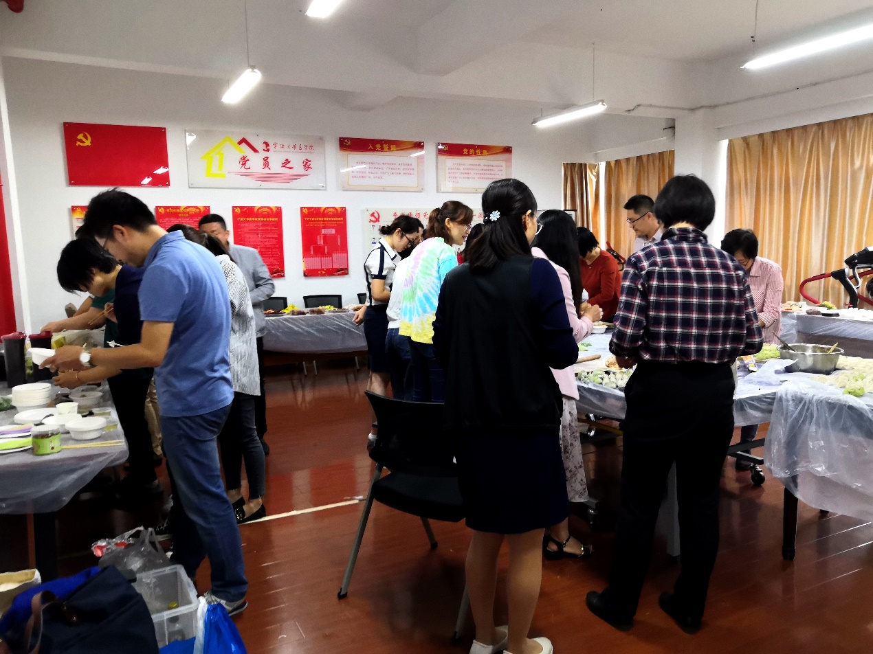 上午10点后,教工小家热闹非凡。一边的老师们忙着拜美食,水果,点心和月饼;一边的老师们忙着包饺子,拌凉菜,煮面条。陆陆续续赶到的老师们拿起碗筷,对食品的美味赞不绝口,对活动的温馨感到暖心。