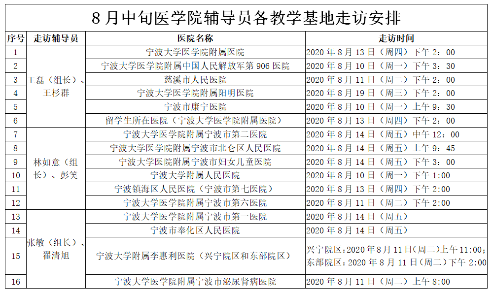8月中旬医学院辅导员各教学基地走访安排