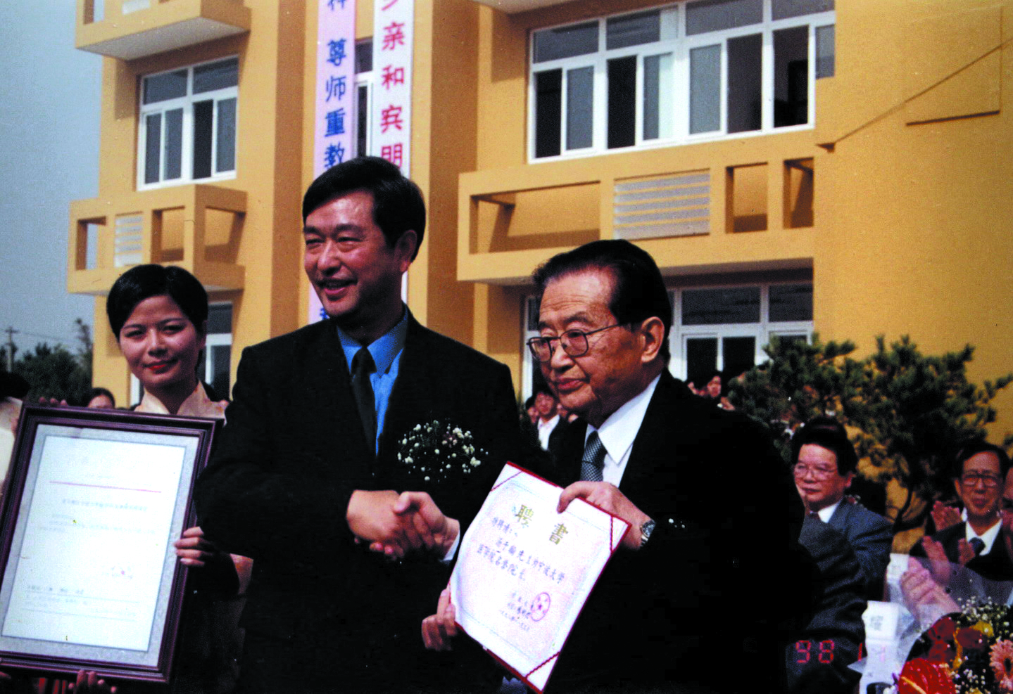 1998.11.03校党委书记李从军向汤于翰先生颁聘书,汤先生愉快接受担任宁大医学院名誉院长。