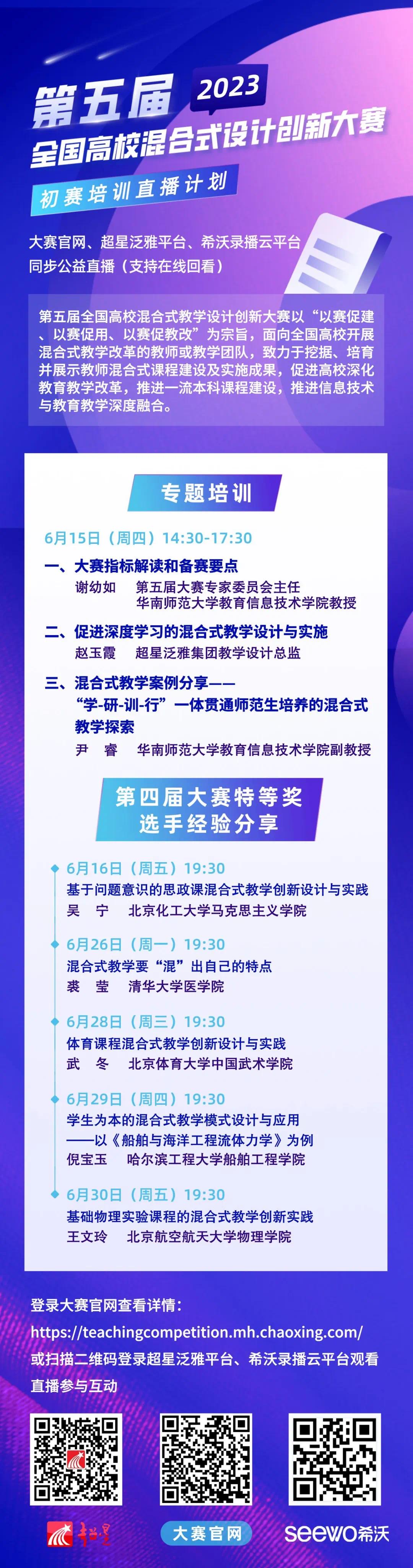 要求参赛主讲教师近 5 年对所参赛的课程讲授2轮以上。以个人或团队形式报名,团队成员可包括 1 名主讲教师和不超过4名团队教师。往届全国高校混合式教学设计创新大赛获得特等奖、一等奖的项目,不重复参赛。