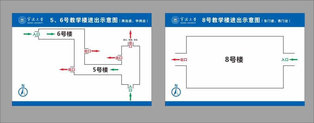 5-6号楼、8号楼上课楼层进出示意图如下,请各位老师同学按照示意图单向进出楼层、按照错峰时间上下课。(1/2/3号楼人数较少,不作进出限制)