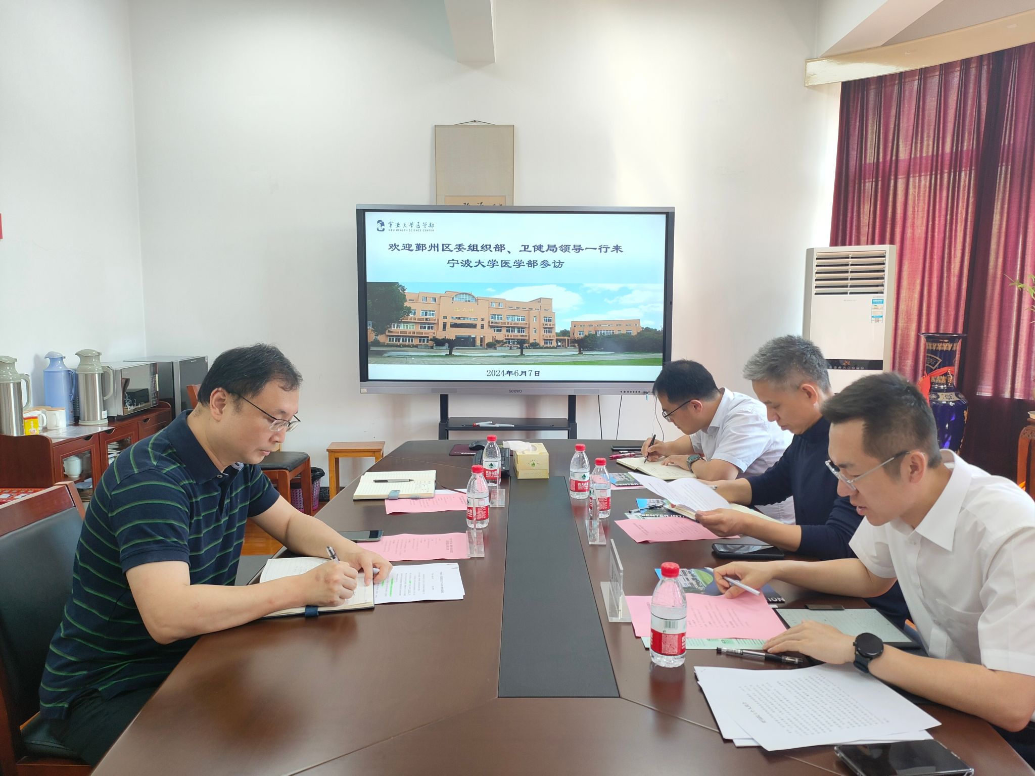 On June 7, Huang Wanjun, a member of the Yinzhou District Committee Organization Department and the full-time deputy director of the Talent Office, together with Zhu Yu, the deputy director and party committee member of the Yinzhou District Health Bureau, visited the Ningbo University Health Science Center to research high-level talent recruitment efforts. They were received by Xu Jin, the deputy director of the Health Science Center.