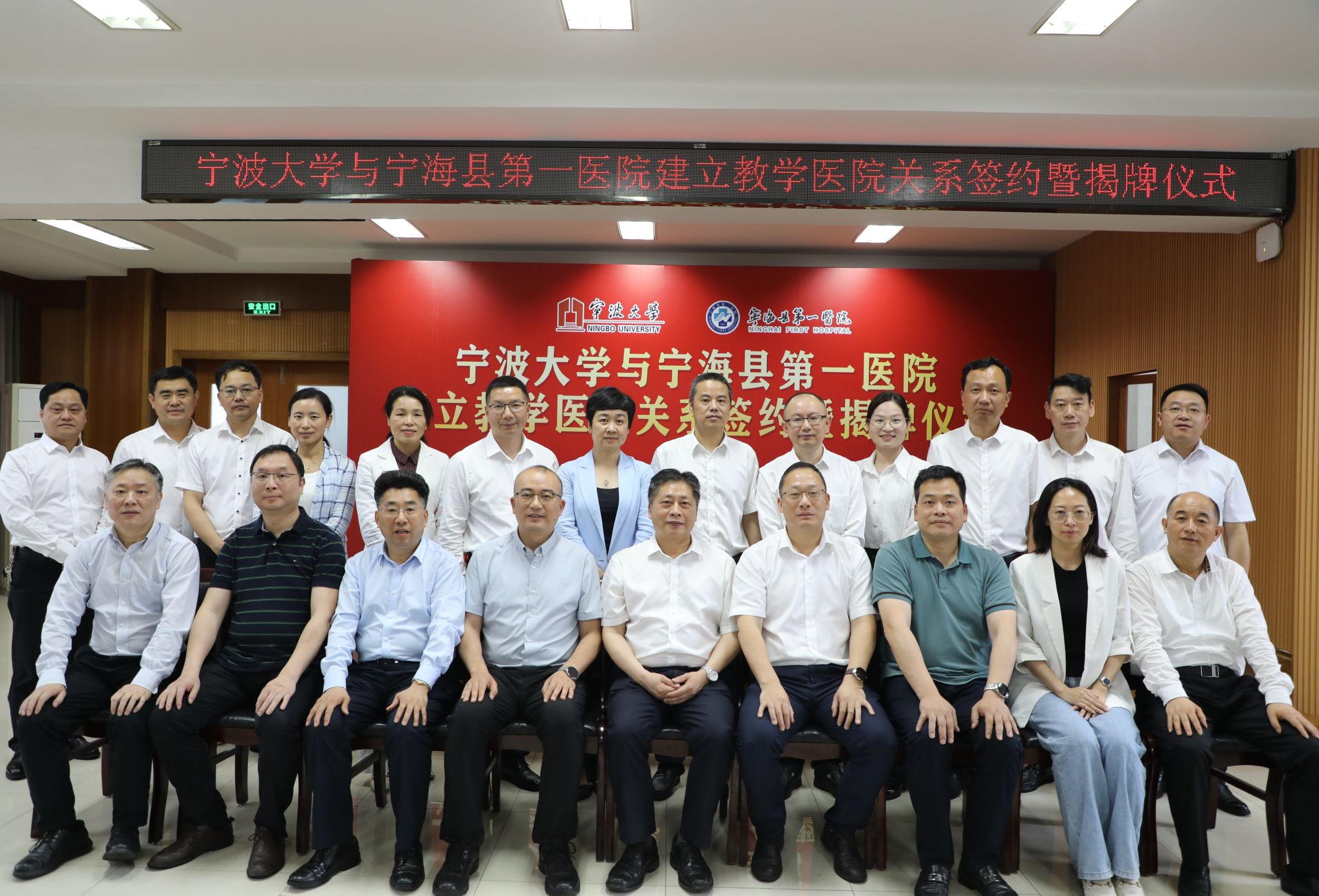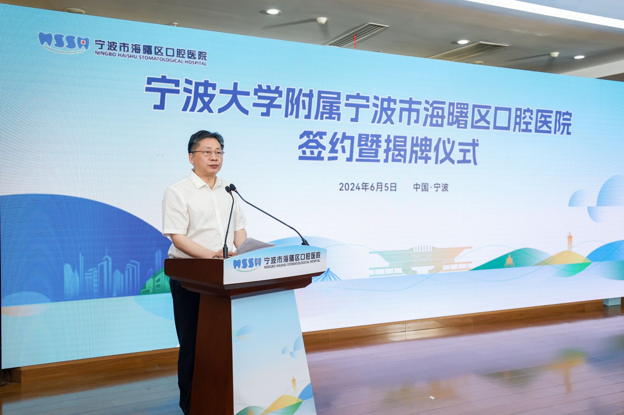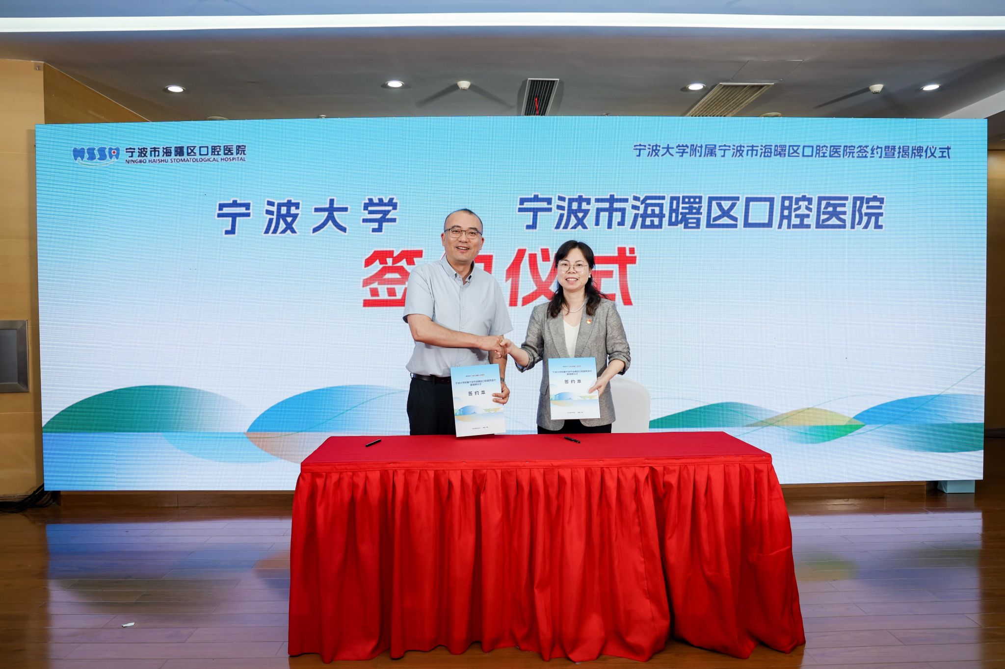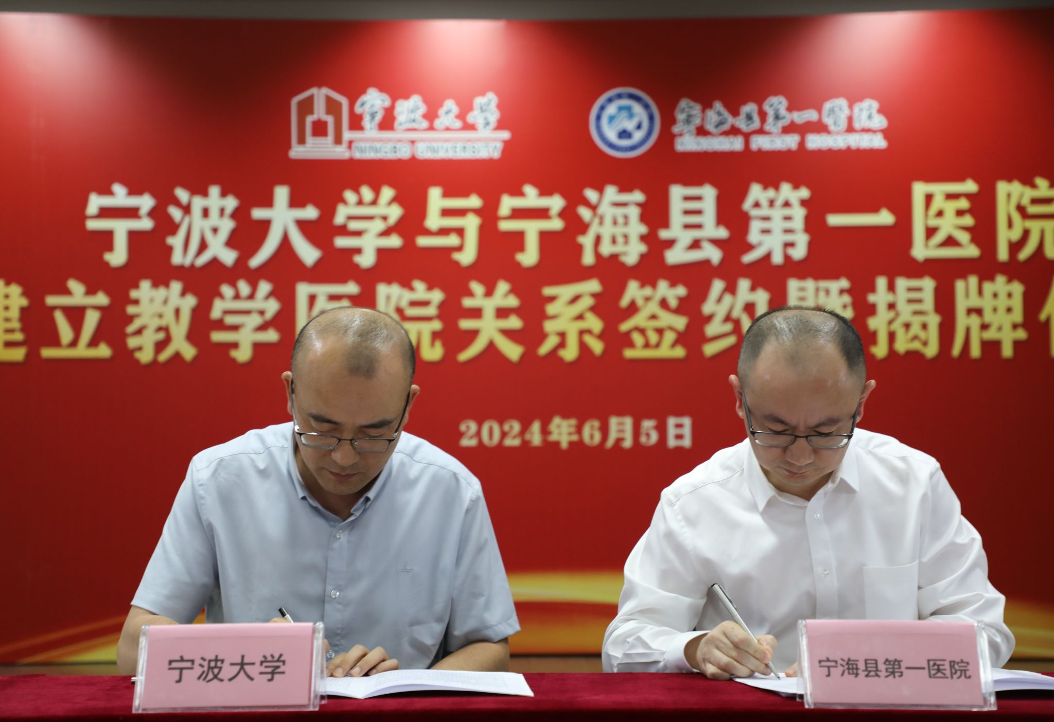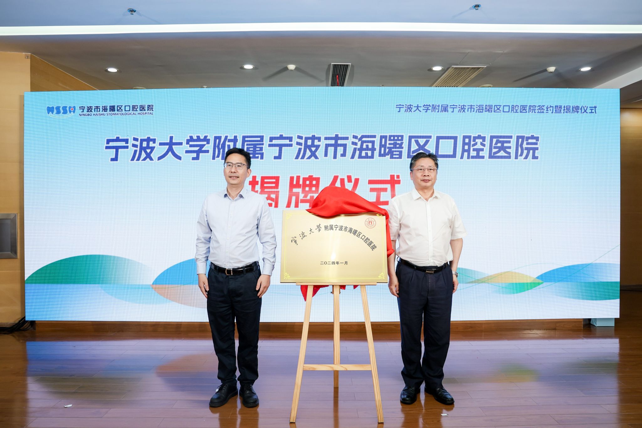 On the afternoon of June 5th, Zhang Zhenzhu, Deputy Secretary of the Party Committee of the school, visited Ningbo Haishu District Oral Hospital and Ninghai County First Hospital to hold a signing ceremony for establishing teaching base relationships and unveiling. Huang Lie, Deputy District Governor of Haishu District, and Guo Wenkui, Deputy County Chief of Ninghai County, attended the ceremony and delivered speeches. Representatives from the office of the district government in Haishu, the health commission team members, the county government office in Ninghai, key members of the health commission team, party and government team members from both hospitals, relevant offices and functional departments, as well as party and government team members from the Health Science Center and related department heads participated in the ceremony.