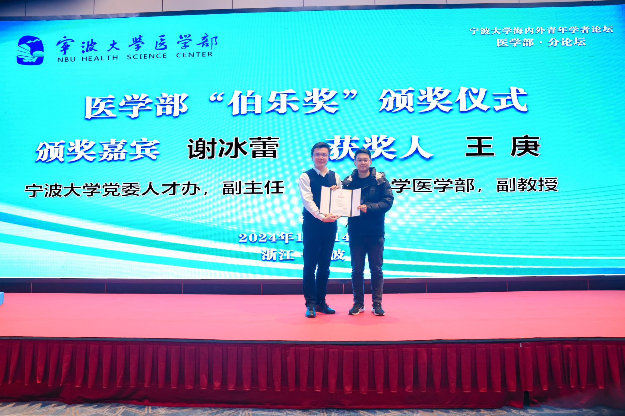 Subsequently, Xie Binglei, Deputy Director of the Party Committee Talent Office of Ningbo University, presented the Bo Le Award to Associate Professor Wang Geng, recognizing his contributions to recommending and assisting in the recruitment of high-level medical talents.