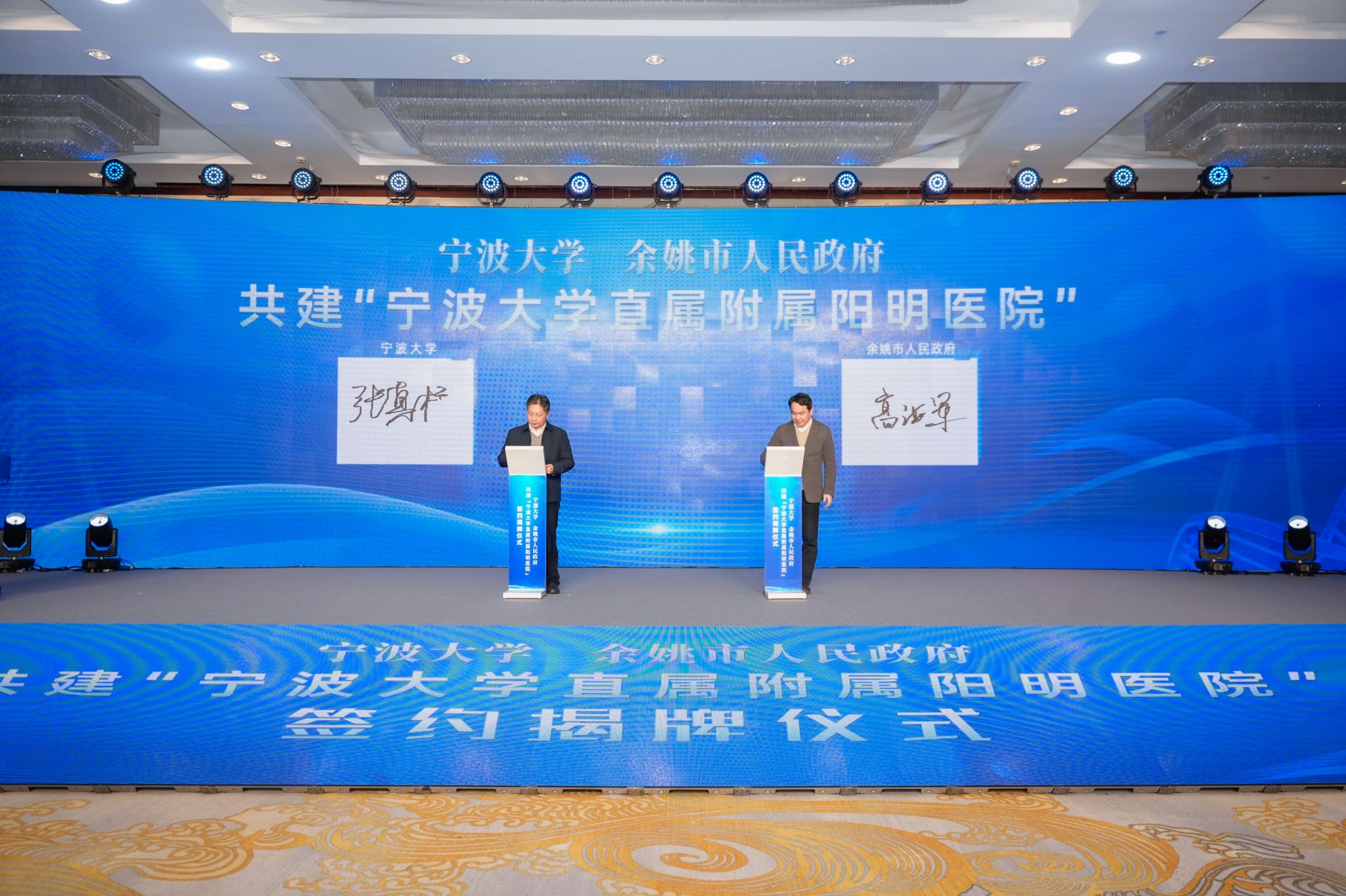 Zhang Zhenzhu and Gao Haijun signed the joint construction agreement. Yuyao People's Hospital officially became a directly affiliated hospital of Ningbo University. Effective immediately, Yuyao People's Hospital was named Ningbo University Affiliated Yangming Hospital (hereinafter referred to as the Affiliated Yangming Hospital). Yuyao People's Hospital will retain its second name.