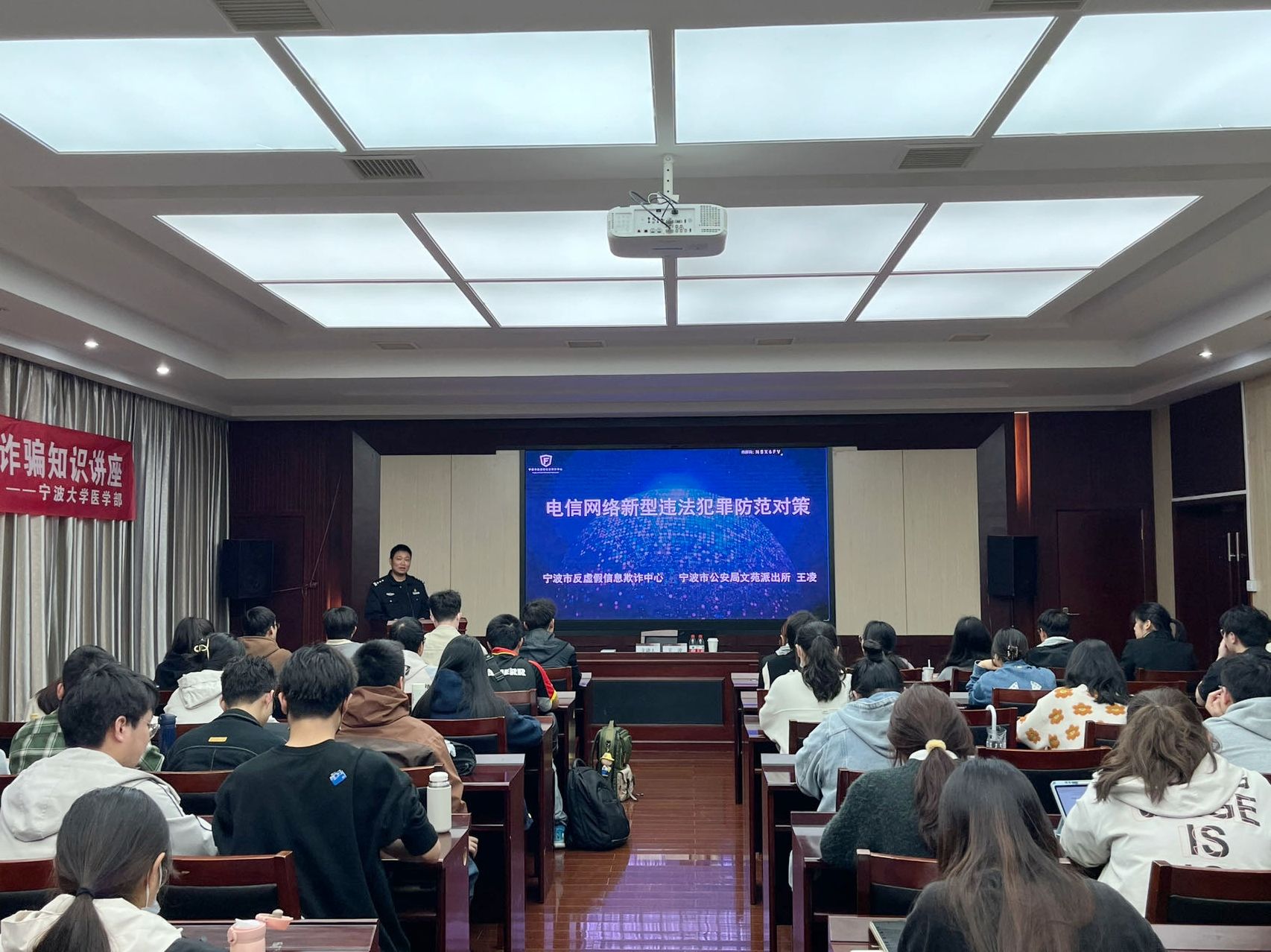 On the evening of April 22nd, the Health Science Center at Ningbo University invited Officer Wang Ling from the Wenyuan Police Station to deliver a lecture titled "Jointly Guarding Against Telecom Fraud for a Harmonious Online Community." Nearly 100 faculty members and students attended the event.