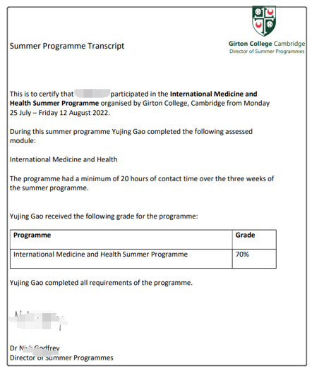 项目学生由剑桥大学格顿学院进行统一的学术管理与学术考核,顺利完成学习后,学生将获得剑桥大学格顿学院颁发的成绩单与项目证书。