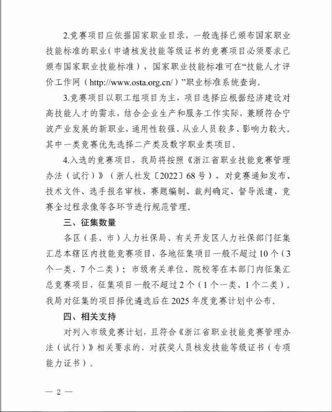 转发宁波市人社局关于征集2025年宁波市职业技能竞赛项目的有关通知,一类二类赛事均限申报1项,有意向申报者请于2025年2月17日前填写附表,并将PDF盖章件及EXCEL电子稿同时发送至康冬丽钉钉。