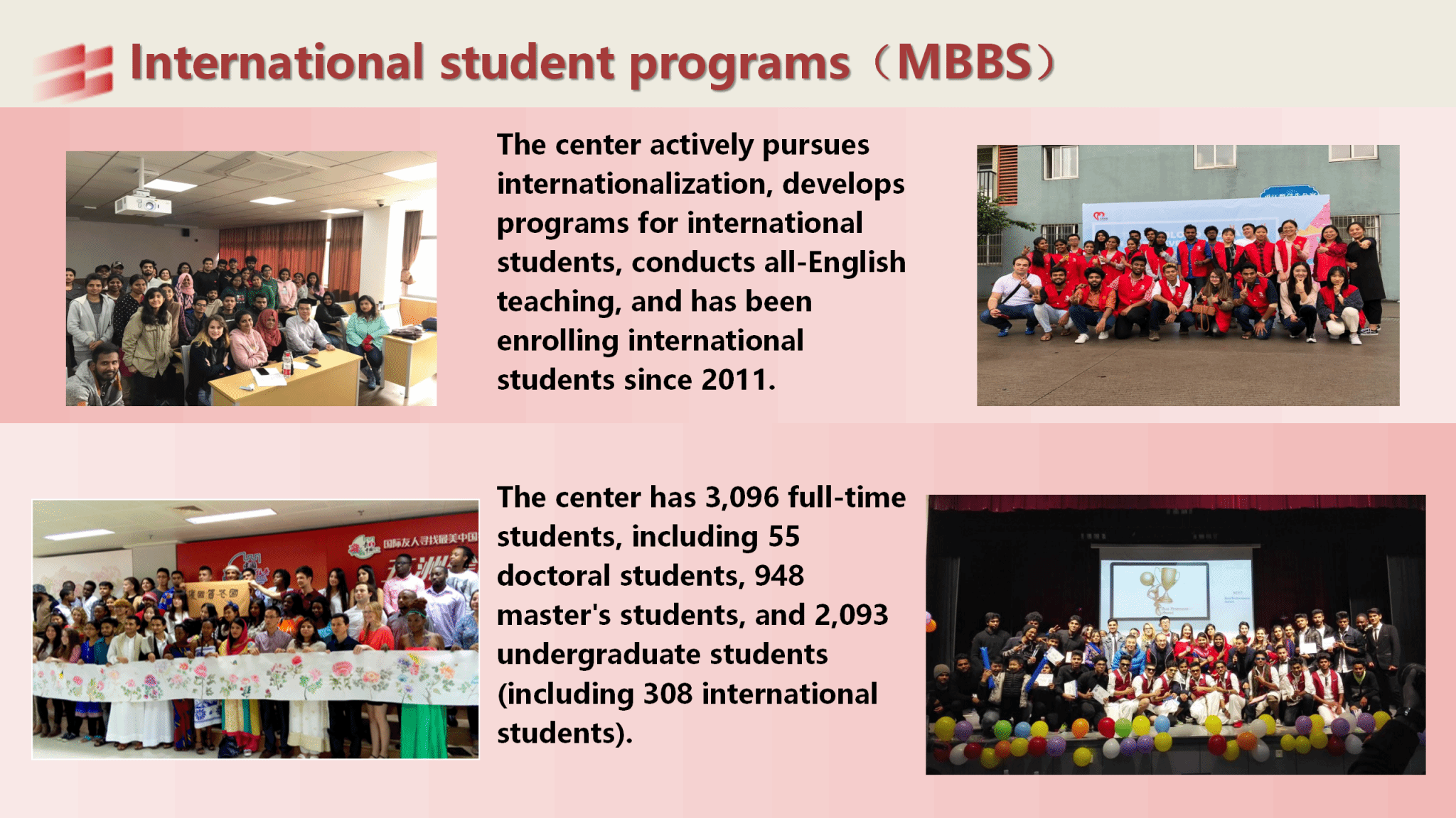 The MBBS program has been approved by the Ministry of Education of China to recruit international students since 2011. The program has gained effective achievements in teaching construction, development and scientific research. Now the School has one state-level teaching team (for core course of MBBS basic medicine teaching), one state-level high-quality curriculum (Human Anatomy), one national bilingual demonstration course (Biochemistry and Molecular Biology), one national high-quality resource sharing course (Human Anatomy), and eight provincial excellent courses. Medical School has been approved for one outstanding talents reform pilot project by Ministry of Education and Ministry of Health (the five-year Clinical Medicine program), two key provincial laboratory, one provincial experimental teaching demonstration center (as basic medicine experimental teaching center), three key provincial disciplines-----clinical medicine, public health and preventive medicine and biological science), ten key municipal laboratories, and three key municipal disciplines, and eight science and technology innovation teams at the city or provincial level. The School has hosted 134 state-level projects (2 key projects) and 269 provincial projects; reaped 14 provincial science and technology awards, 71 invention patents;published 1554 papers (including 903 SCI papers, 25 highly-cited ESI papers), 11 textbooks and monographs. In 2012 field ranking by Ministry of Education, clinical medicine program of Medical School, Ningbo University ranked 40th among all colleges and universities. According to the Thompson ESI data released on May 7th, 2015, our clinical medicine program enters into the top 1% among the global academic institutions list for the first time.