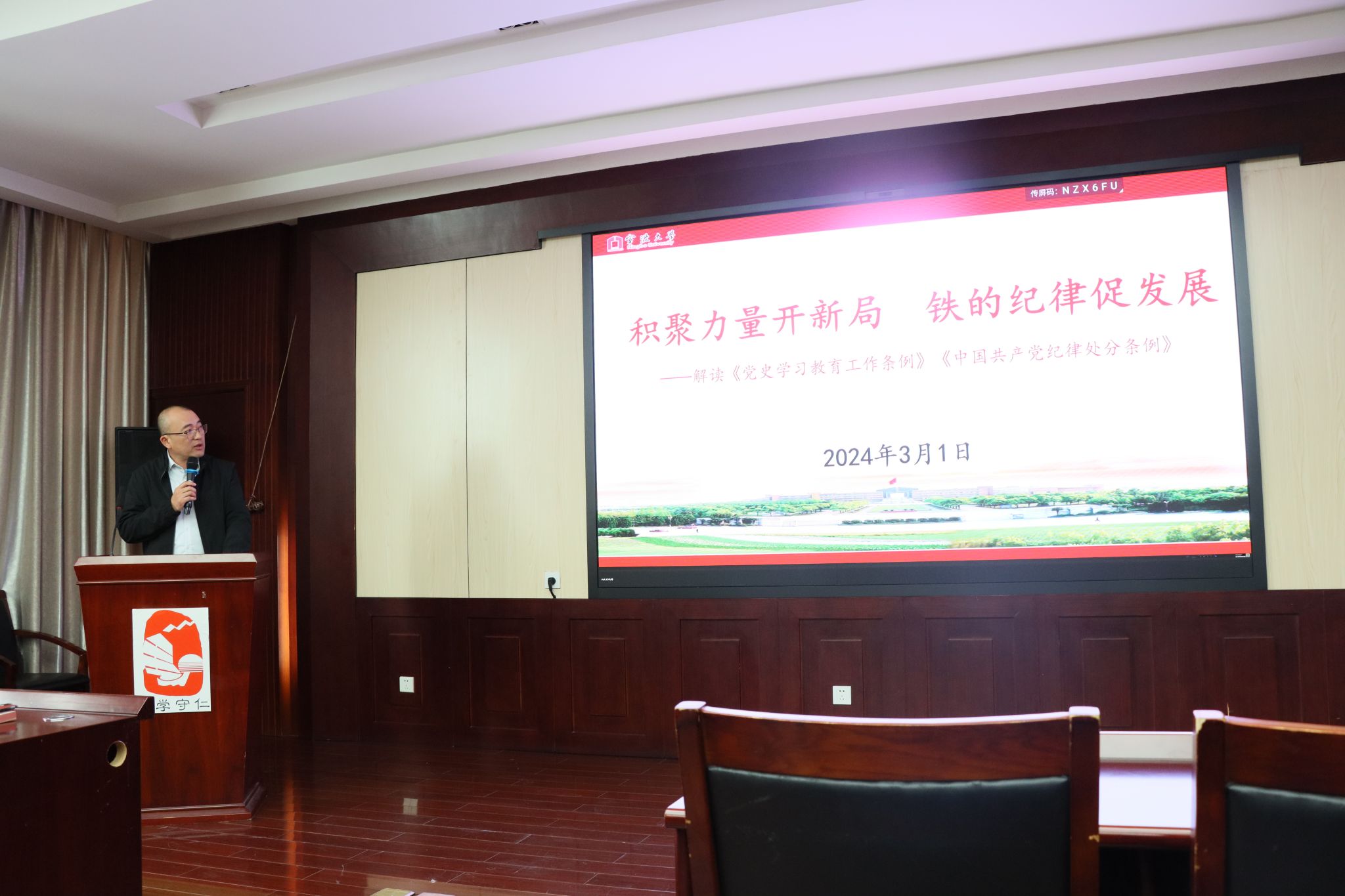 3月1日下午,党委常务副书记王钱永聚焦《党史学习教育工作条例》《中国共产党纪律处分条例》两个条例,开展题为《积聚力量开新局,铁的纪律促发展》开学第一讲党课。